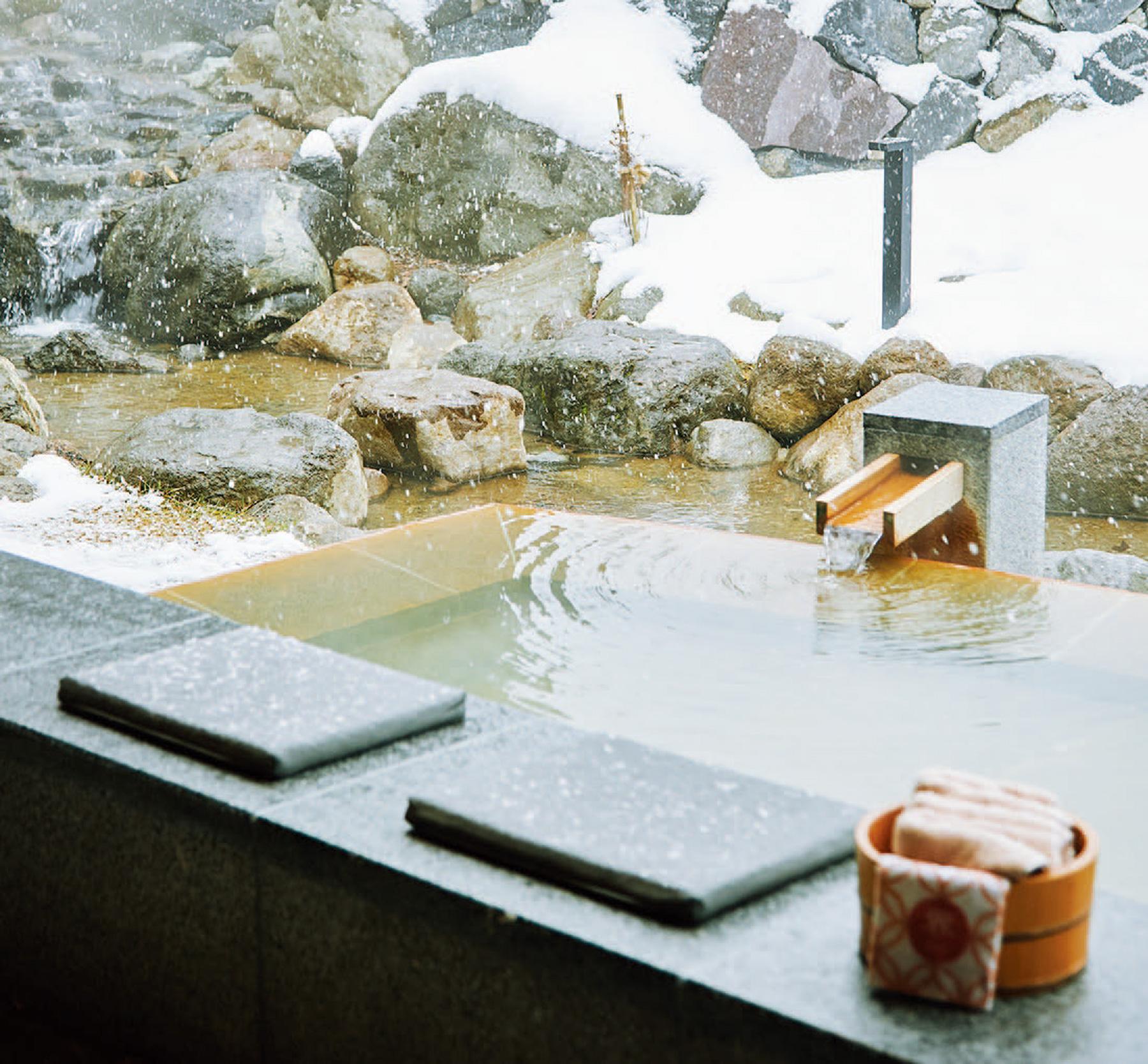 温泉は、中庭に面した足湯、雪の中から空を見上げる感覚で湯が楽しめる大浴場の露天風呂、そしてお風呂付きの部屋もあり。湯守が平湯の湯を解説する「温泉いろは」に参加すれば、より楽しくなること間違いなし。