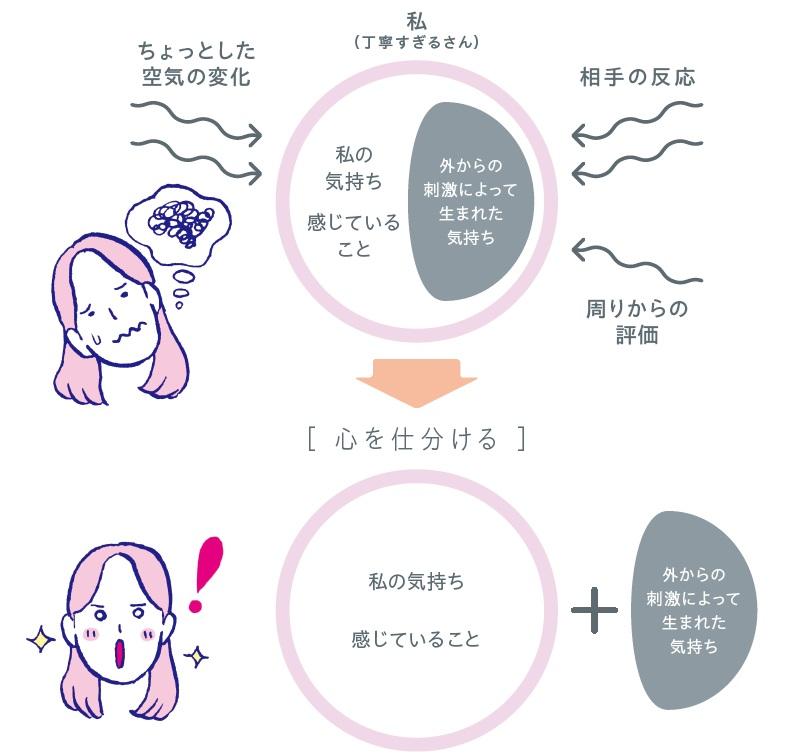 「丁寧すぎるさんは、相手のリアクションに敏感です。目の前の人が眉を上げたら、その人は少し驚いただけだったかもしれないのに、『言うタイミングがよくなかったのかも。いや、発言したこと自体ダメだったに違いない』と悪い方向に妄想を膨らませがちです。こうした相手のリアクションや、周りからの評価という外からの刺激が、丁寧すぎるさんの心を浸食して、自分自身の本心にどんどん気づけなくなっていってしまうのです。丁寧すぎるさんにとっては、相手の行動や言葉だけでなく、匂いや音なども心を乱す大きな要因に。そこで、自分の気持ちや感じていることと、外からの刺激によって生まれた気持ちを分別する“心の仕分け”をする必要が出てくるのです」