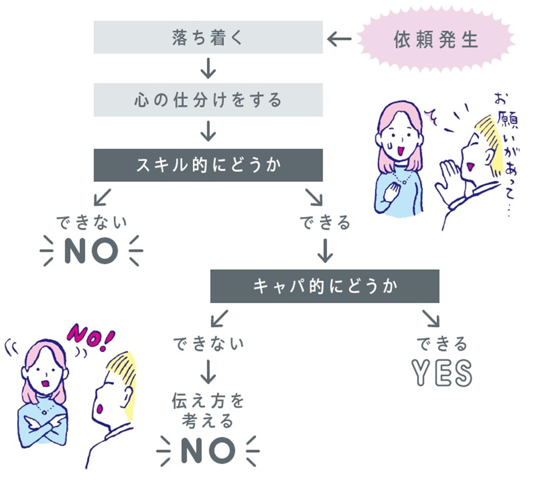 依頼発生→落ち着く→心の仕分けをする→スキル的にどうか→できないならNO!