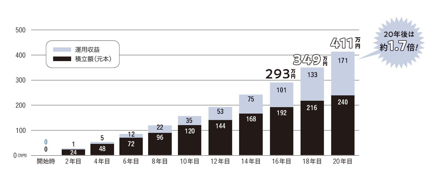 毎月1万円をコツコツ積み立て投資し、平均利回り5%で運用した場合、元金総額240万円に対し、運用収益は171万円に。「今回の暴落のように相場は短期的には上下しますが、長期的には右肩上がり。ほとんど増えない預金と比べると、その差は歴然です」