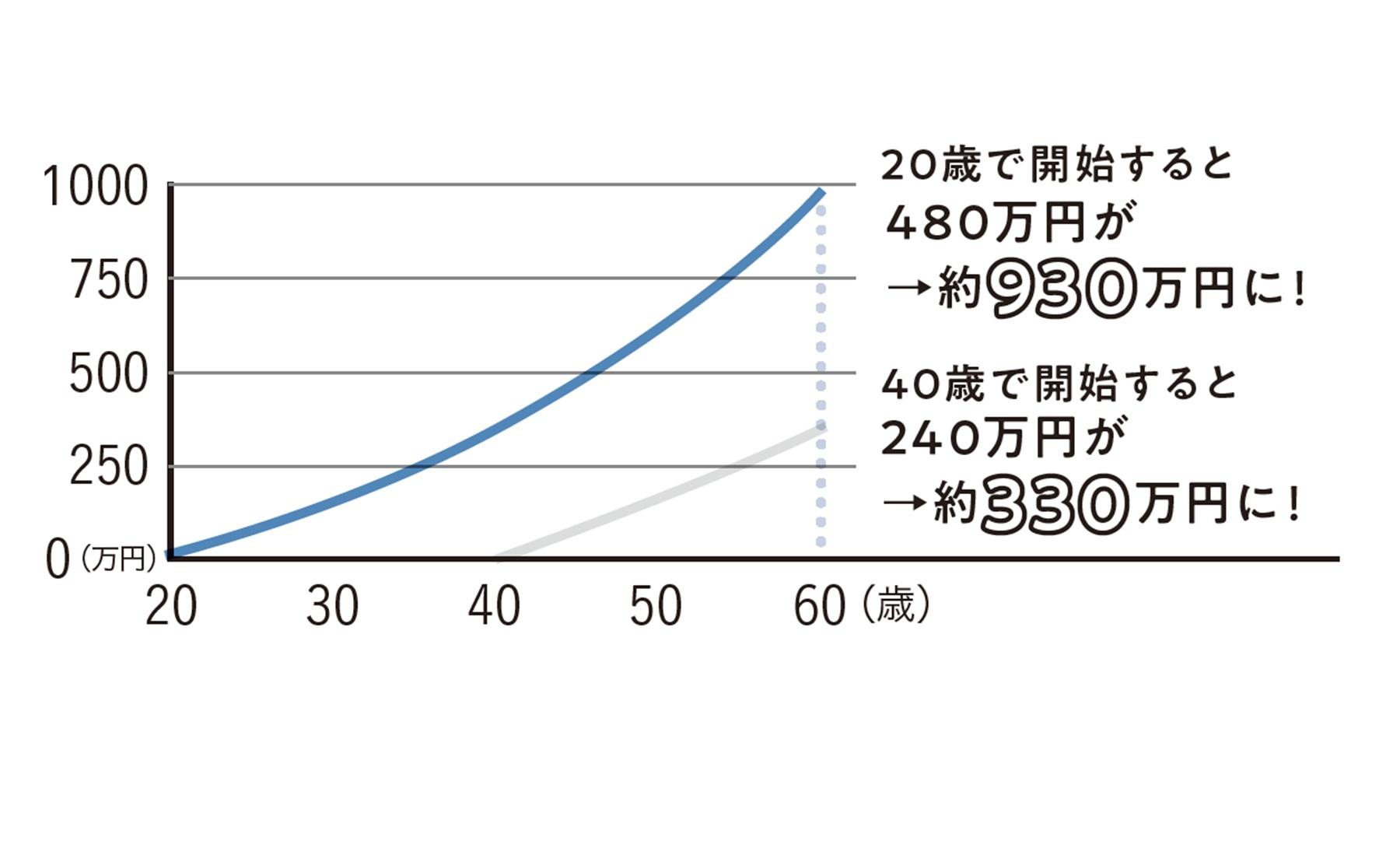 過去のデータを見ても、10年、20年と時間をかければ株式は成長。「その間に出た利益を使わず、元本に組み入れて再投資すると、利益が利益を生むように。これを複利といいます。上のグラフで、後半になるほど運用益の伸びが大きくなっているのは、まさにこの複利の効果。早く始めるほど時間を味方につけられるのです」