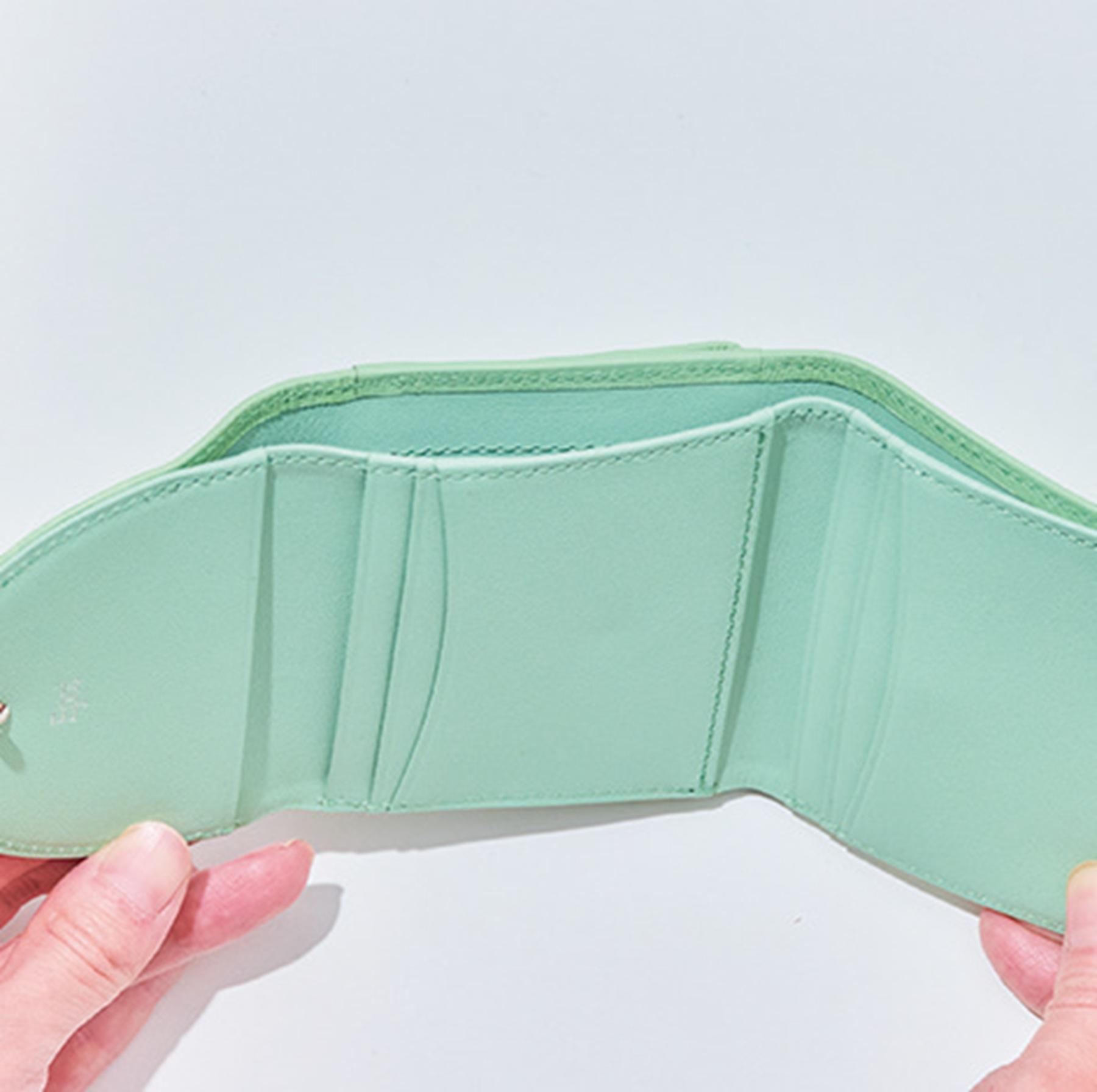 内側に3段のカードスロットを2つ備えた三つ折りウォレット。外側にはボックスタイプのコインポケットがあり、財布を開かず小銭が取り出せる。パステル調のカラーや丸みのあるフラップのデザインもかわいい。W9.5×H8×D3cm¥36,300((Epoi)/(Epoi)本店 TEL:03・5843・1621)