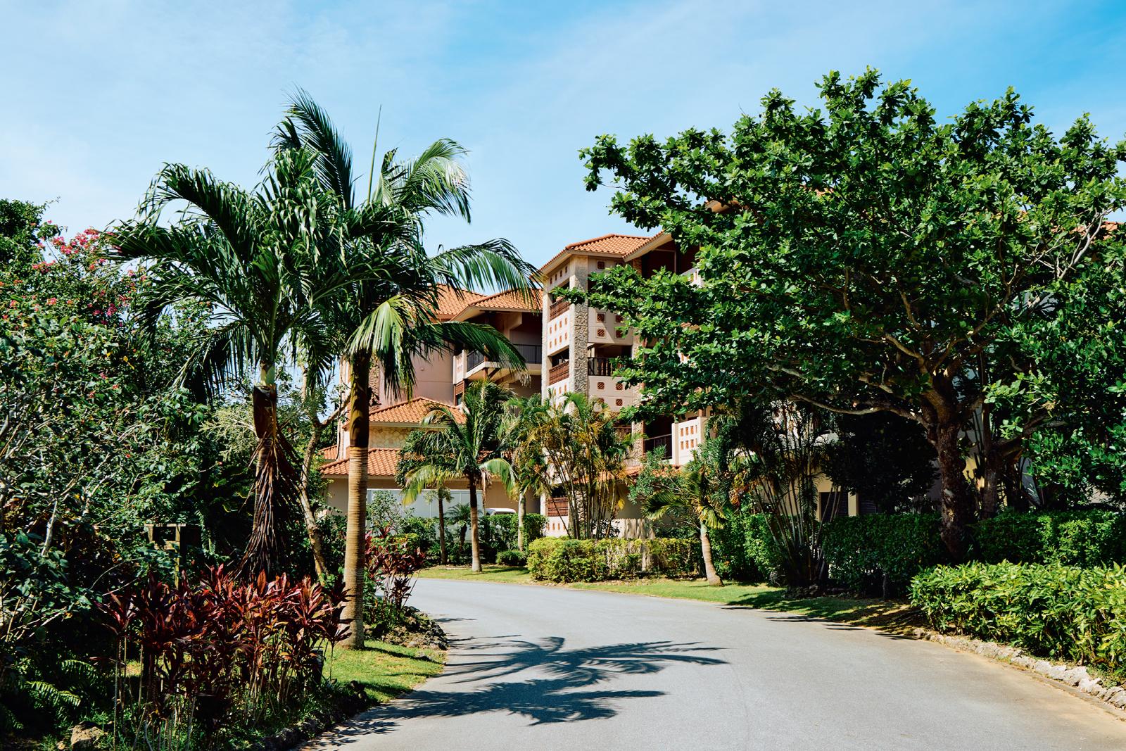 ホテルエントランスに続く道沿いにはヤシの木や亜熱帯の植物が茂り、南国気分上々!