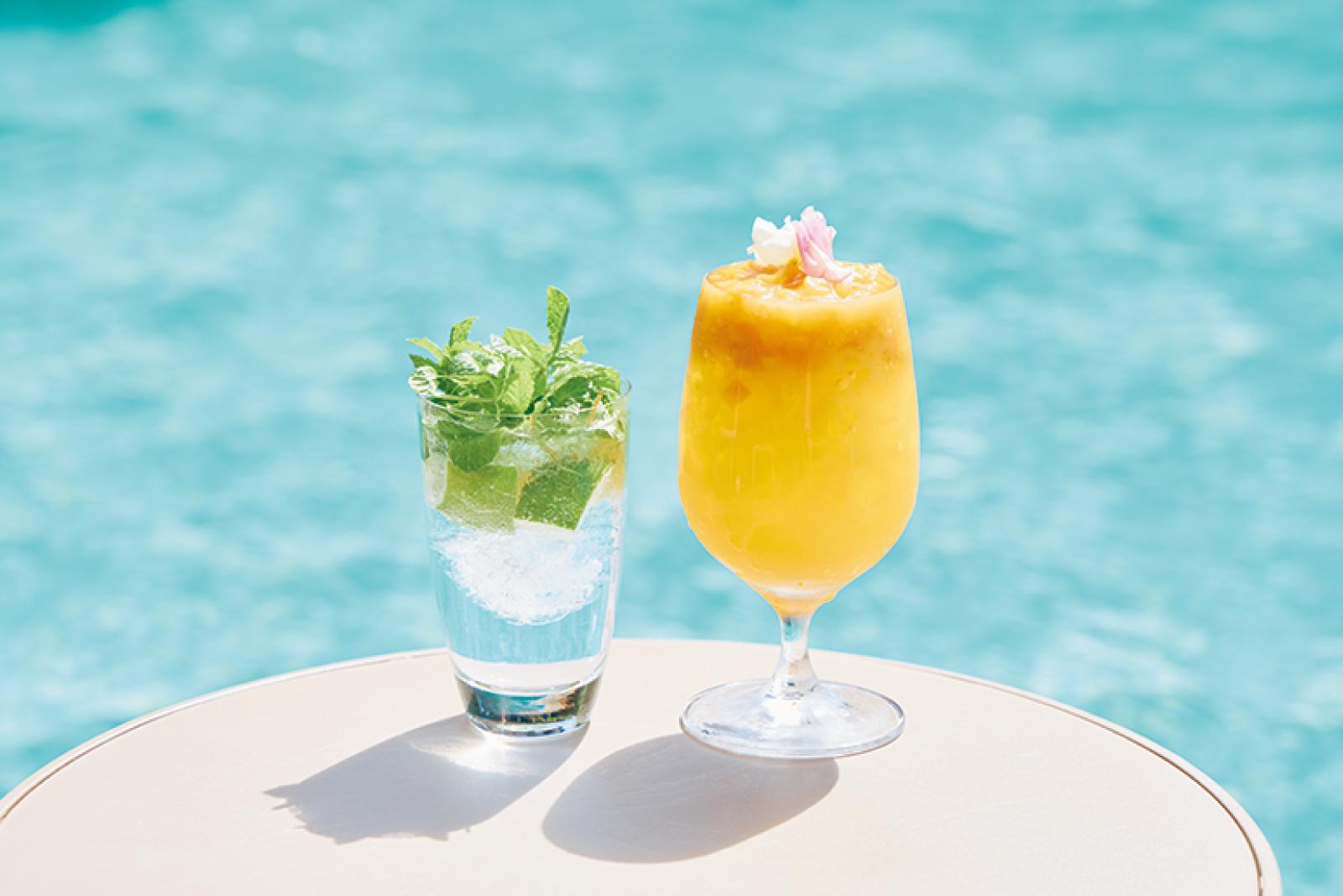 朝晩の食事はビュッフェ。夕食には沖縄らしい食材の料理が約60種並び、ライブキッチンでは“西表の日”と“アジアの日”のメニューを日替わりで提供。プールサイドでドリンク(¥1,000~)を楽しめる「イリオモテトロピカルサマー」にも注目。
