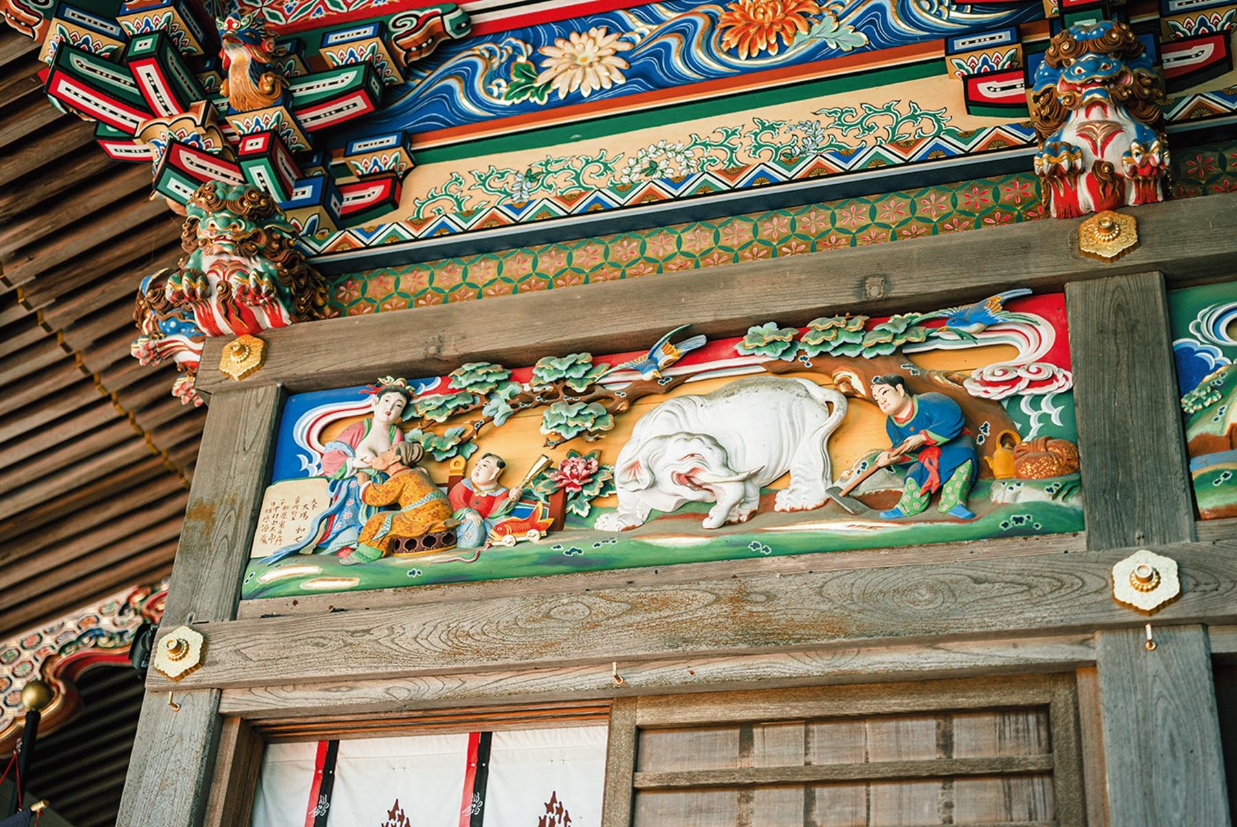 ご鎮座1900年を奉祝した大改修で彩りを取り戻した社殿。欄間には中国の故事である「二十四孝」や出世を意味する「登り竜」など、さまざまな彫刻が施されている。