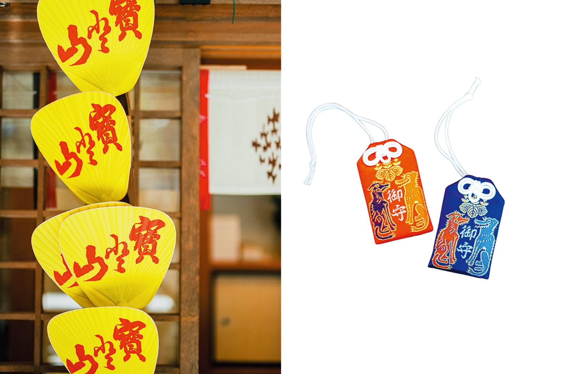 左・火防や金運隆盛のうちわといわれる「縁起うちわ」(初穂料¥300)。右・難を解除する神犬の総守。