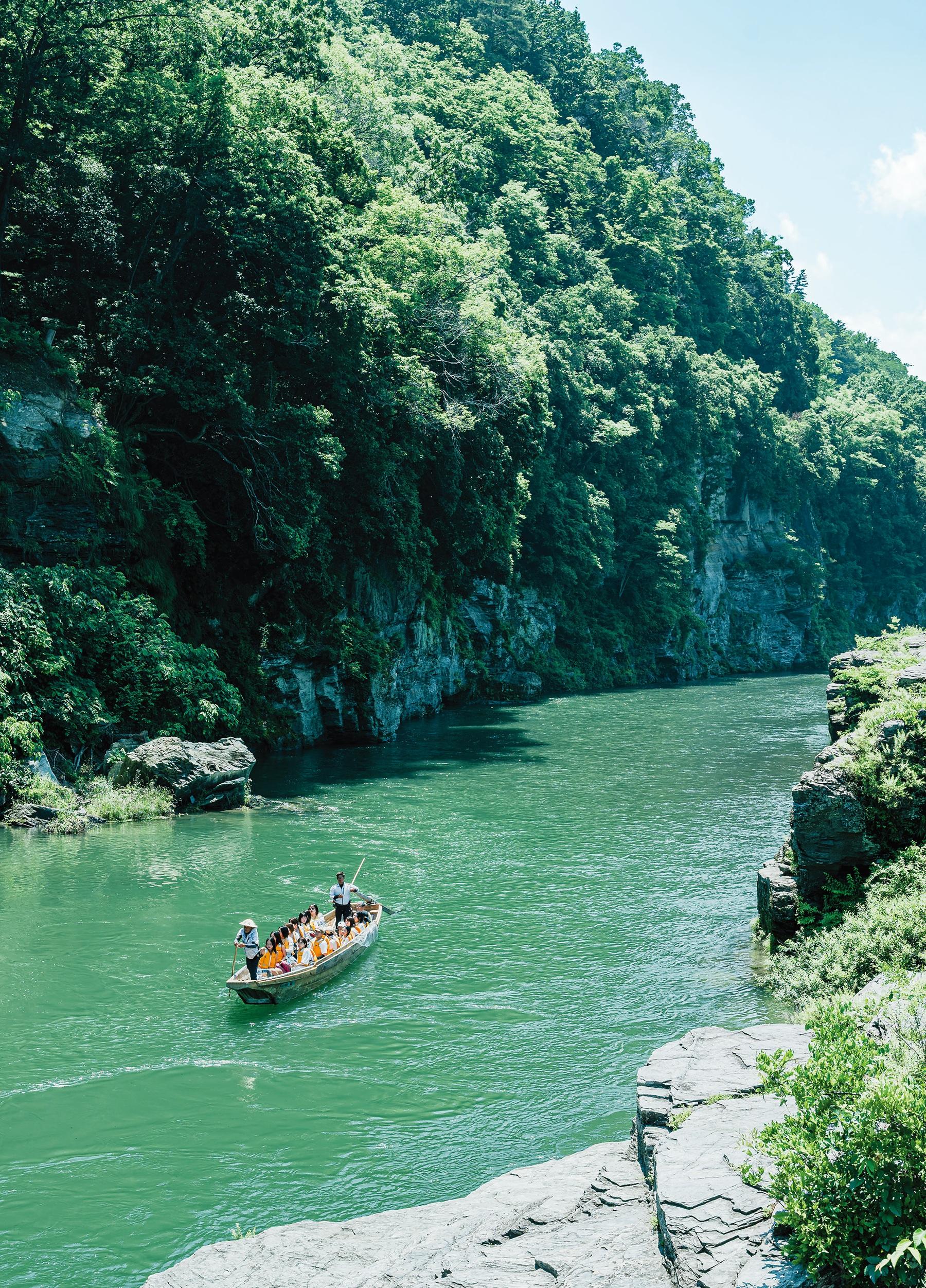 荒川を昔ながらの船で下る体験。約3kmを15~20分かけて進み(水量で変動あり)、長瀞を象徴する岩畳や地層などの渓谷美、すっぽんや魚などの水辺の生き物との出合いなど豊かな自然を堪能できる。かと思えば、急流スポットではそのスピードに驚いたり水をかぶるなど刺激的! 癒しとドキドキの両方を味わって。