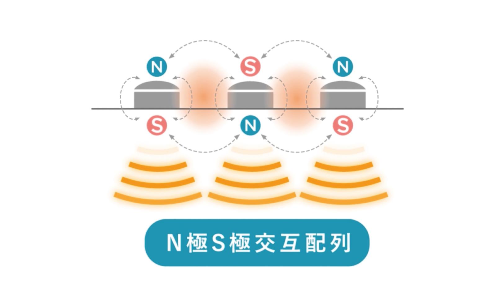 磁石のN極とS極を交互に配置することで磁気の効果を最大限に引き出すことが。磁力が面で広範囲に広がるため、装着部位の血行を効率よく改善し、コリをしっかり緩和する。
