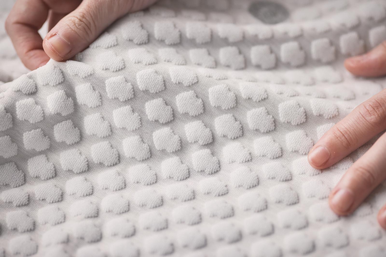 独自で開発した特殊凹凸加工生地「Switch-Tex™」を採用。生地の裏面はパイル素材で、ブランドのロゴマークをかたどった愛らしさと、ポコポコとやわらかな感触が心地よく、凹凸感がさらなる寝心地のよさを演出します。