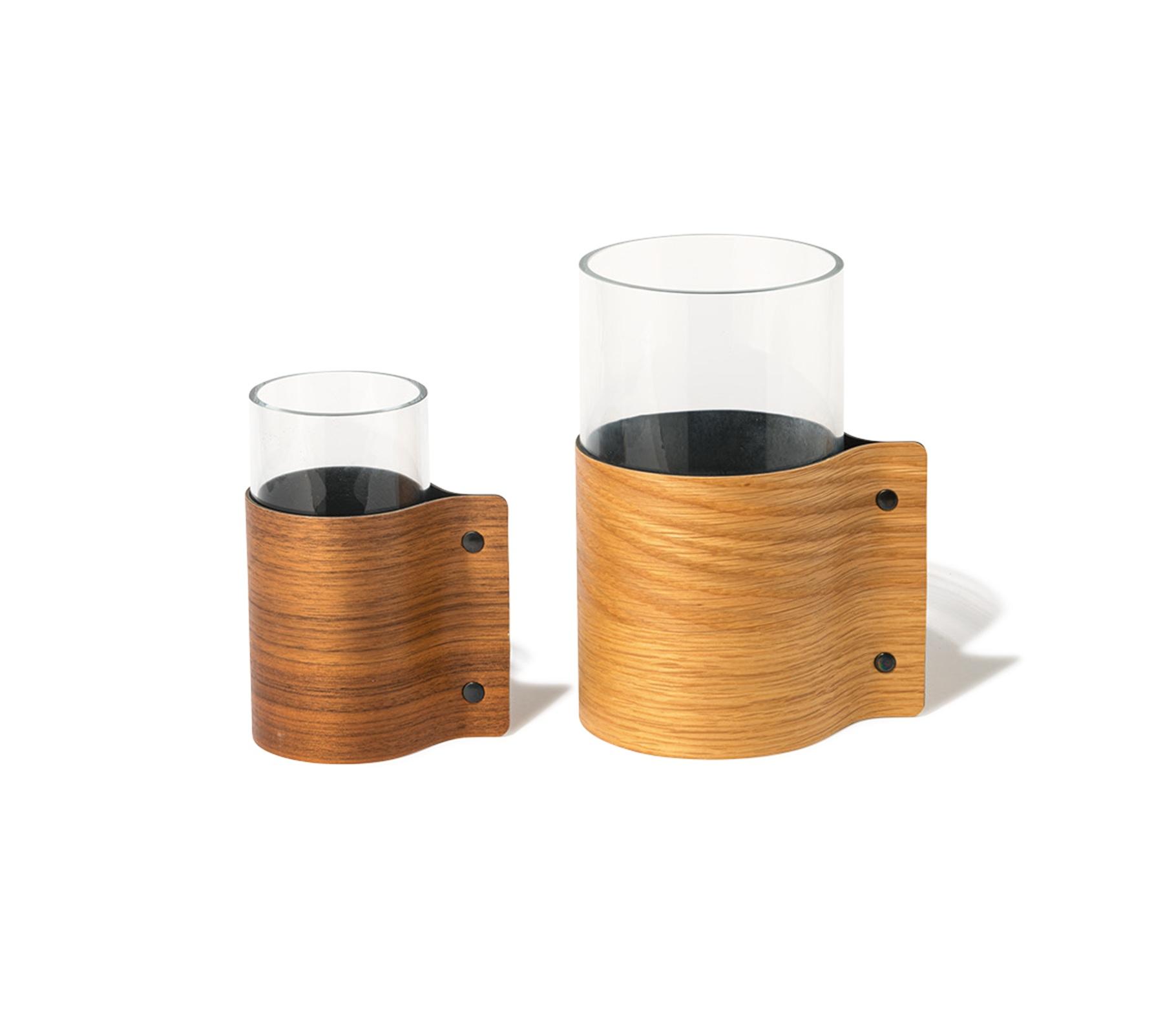 ガラスに木目模様の革を巻きつけたフラワーベースは使い勝手も◎。使われているのはエコテックス認証を受けたリサイクルレザーで環境にも配慮。
