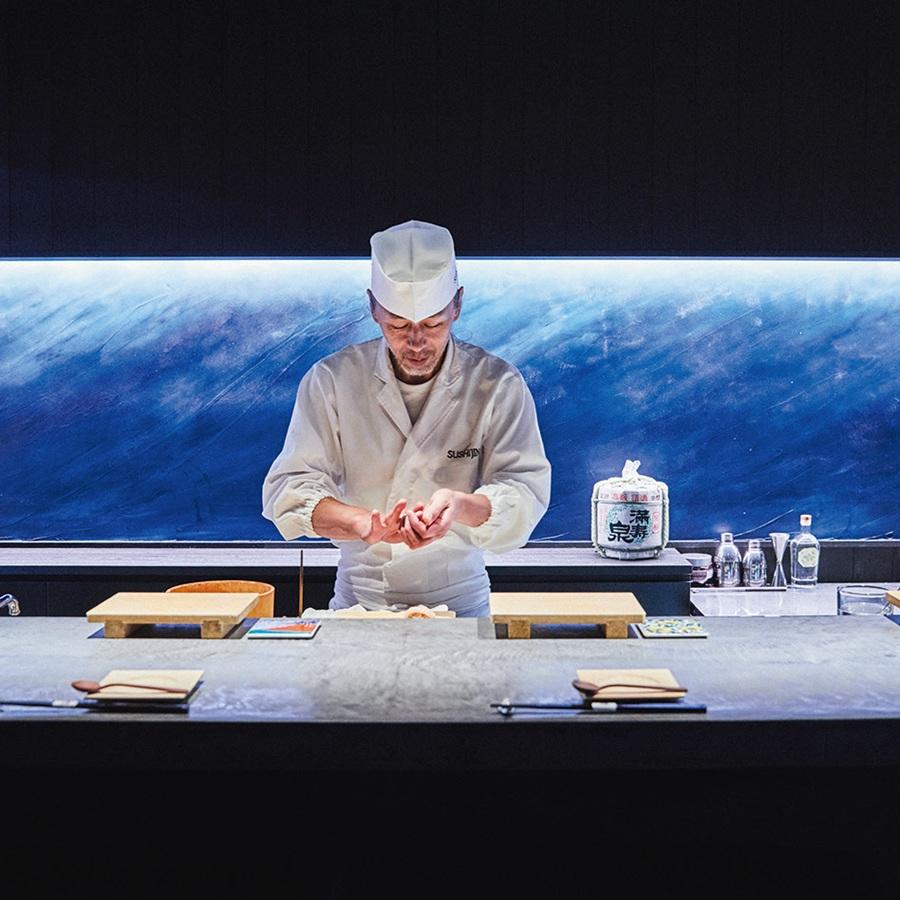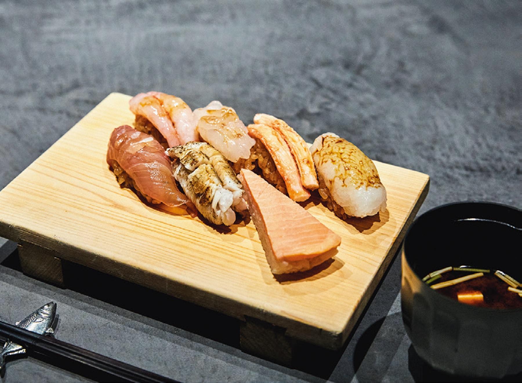 富山の人気店『鮨し人』が移転。「本格鮨を予約なしでも気軽に楽しめるように、立ち喰いスペースを作りました」と店主の木村泉美さん。ハイスツールが並ぶ空間は気どらない雰囲気。とはいえ、まろやかな赤酢を使ったシャリが新鮮なネタを引き立てる握りは、富山時代と変わらぬ美味しさ。