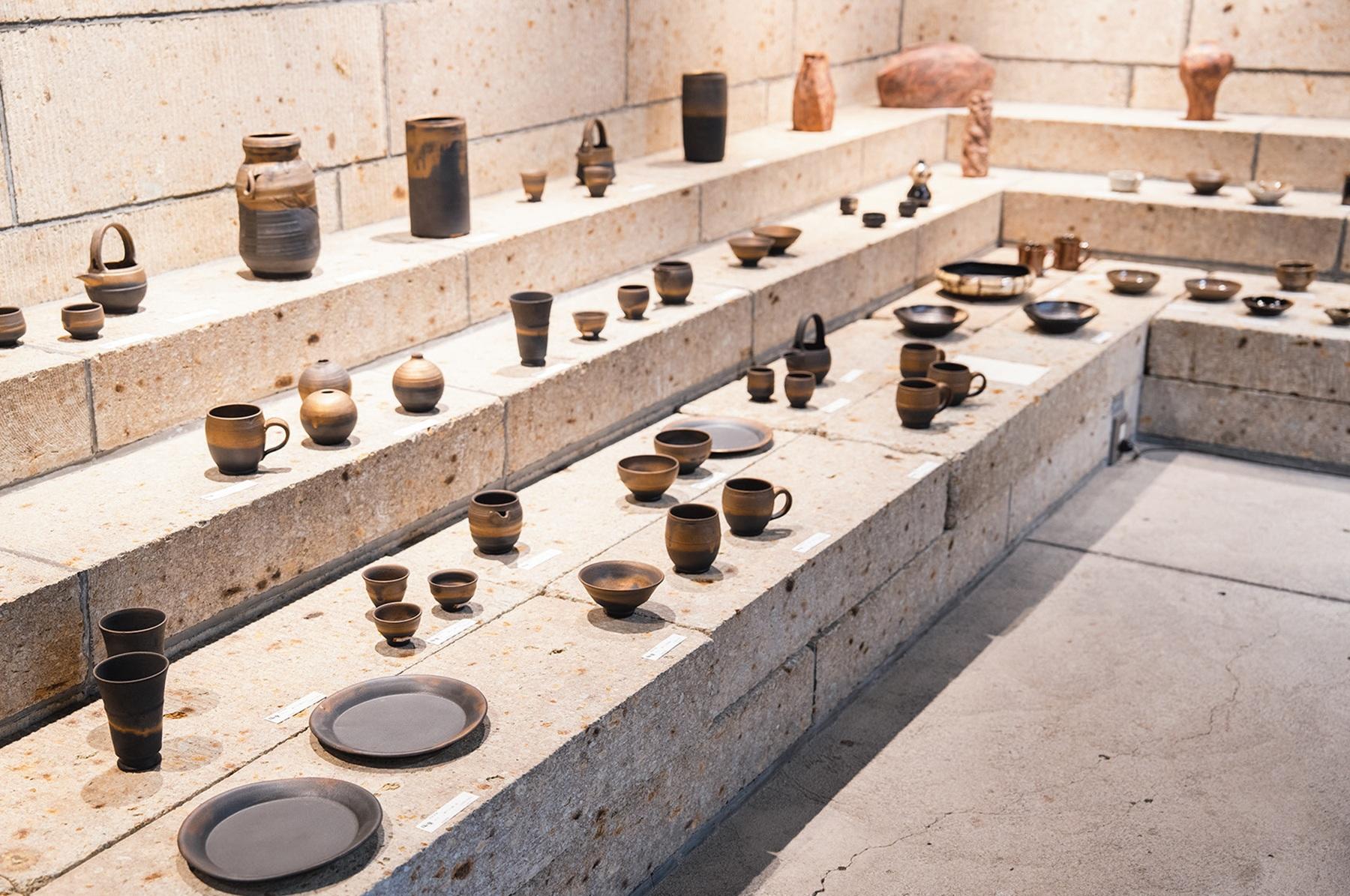 作品の雰囲気を際立たせるギャラリーの石段は、宇都宮市で採石される大谷石で作られたもの。オリジナルブランド『道祖土和田窯』のうつわをはじめ、常時40名ほどの作家の作品を揃えており、目移りする品揃え。