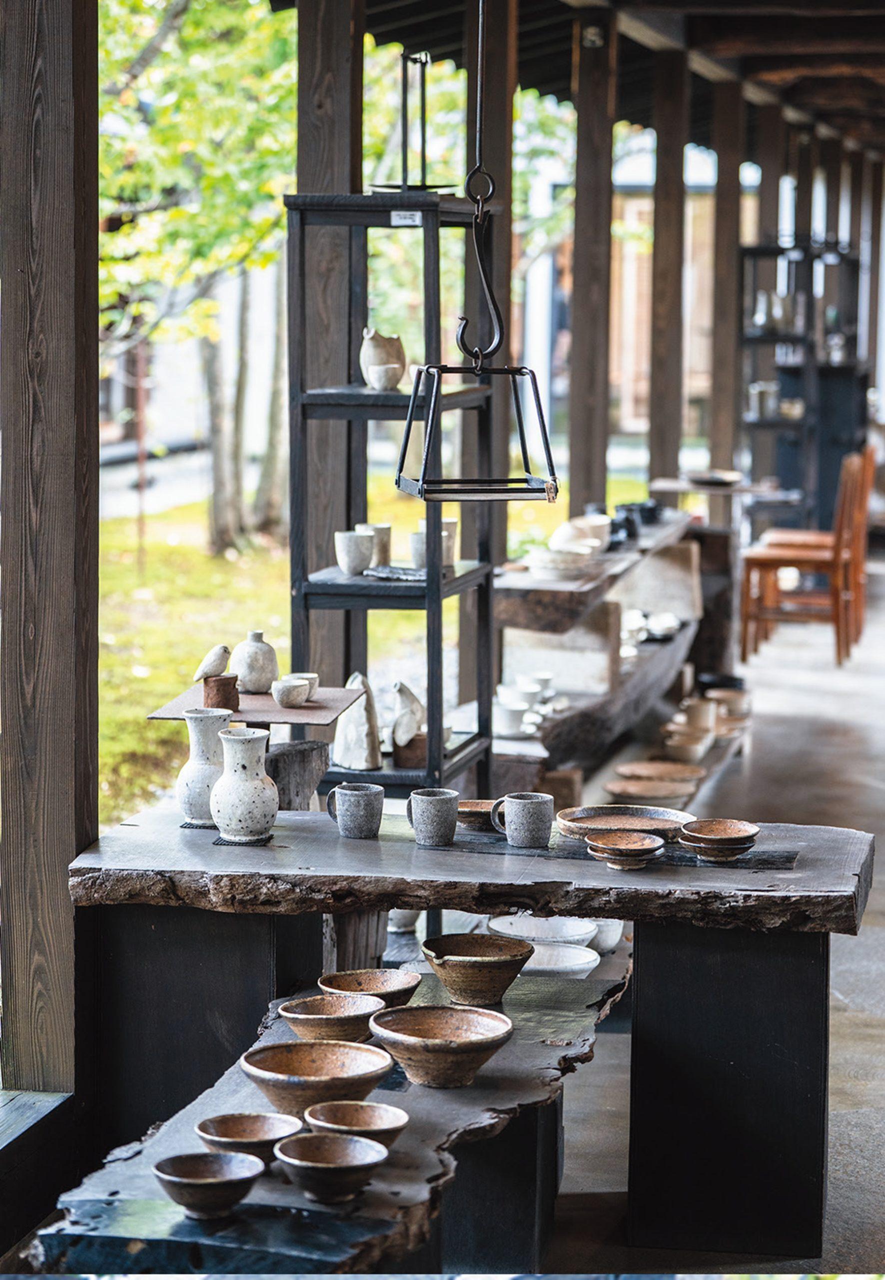 時間や天気、季節によって装いを変える苔庭を背景に、陶器を見て回ることができるので、ちょっとした散策気分を味わえる。