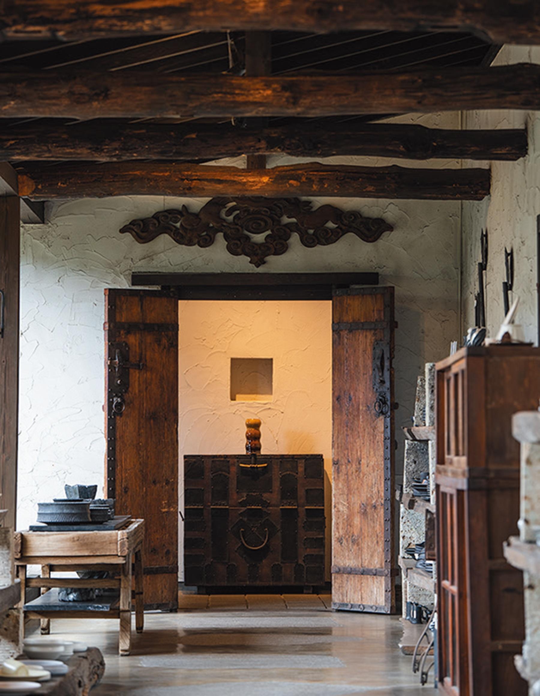 店内で使用される和の趣を感じられる什器や天井の梁などは石岡市の古民家から譲り受けたもの。