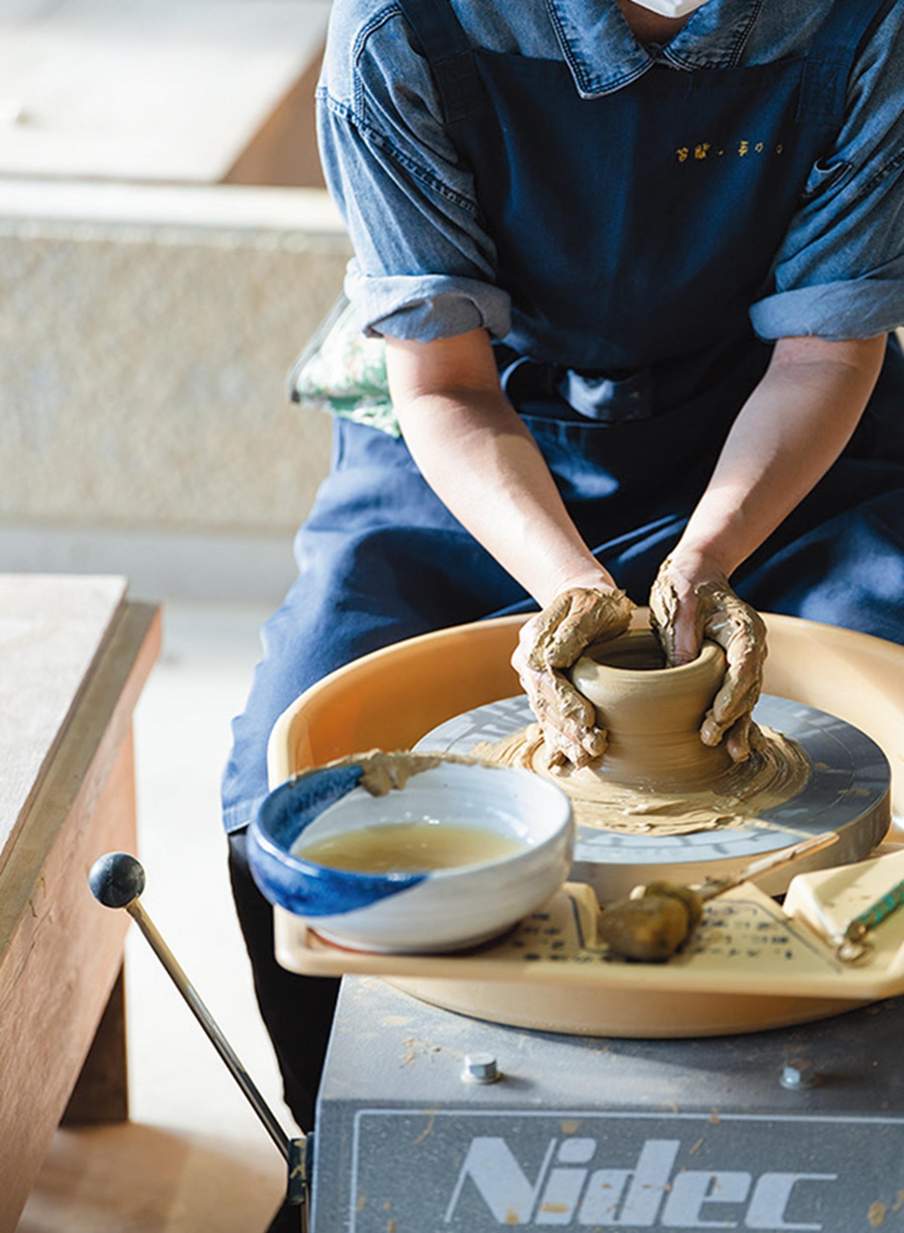 ろくろを使った陶芸体験。自ら成形したうつわは愛着もひとしお。手びねり体験もある。