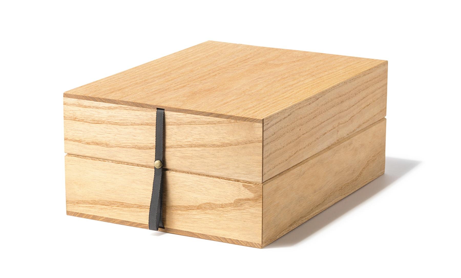 衣類の他、ゴムやナイロンの加水分解を防いでくれるので、スニーカーや鞄の収納にも重宝。アクセントのストラップは、グレー、グリーン、オレンジの3色から選べる。W26×D35×H15cm ¥38,500(キリフト/美術木箱うらた TEL. 0766-36-2253)