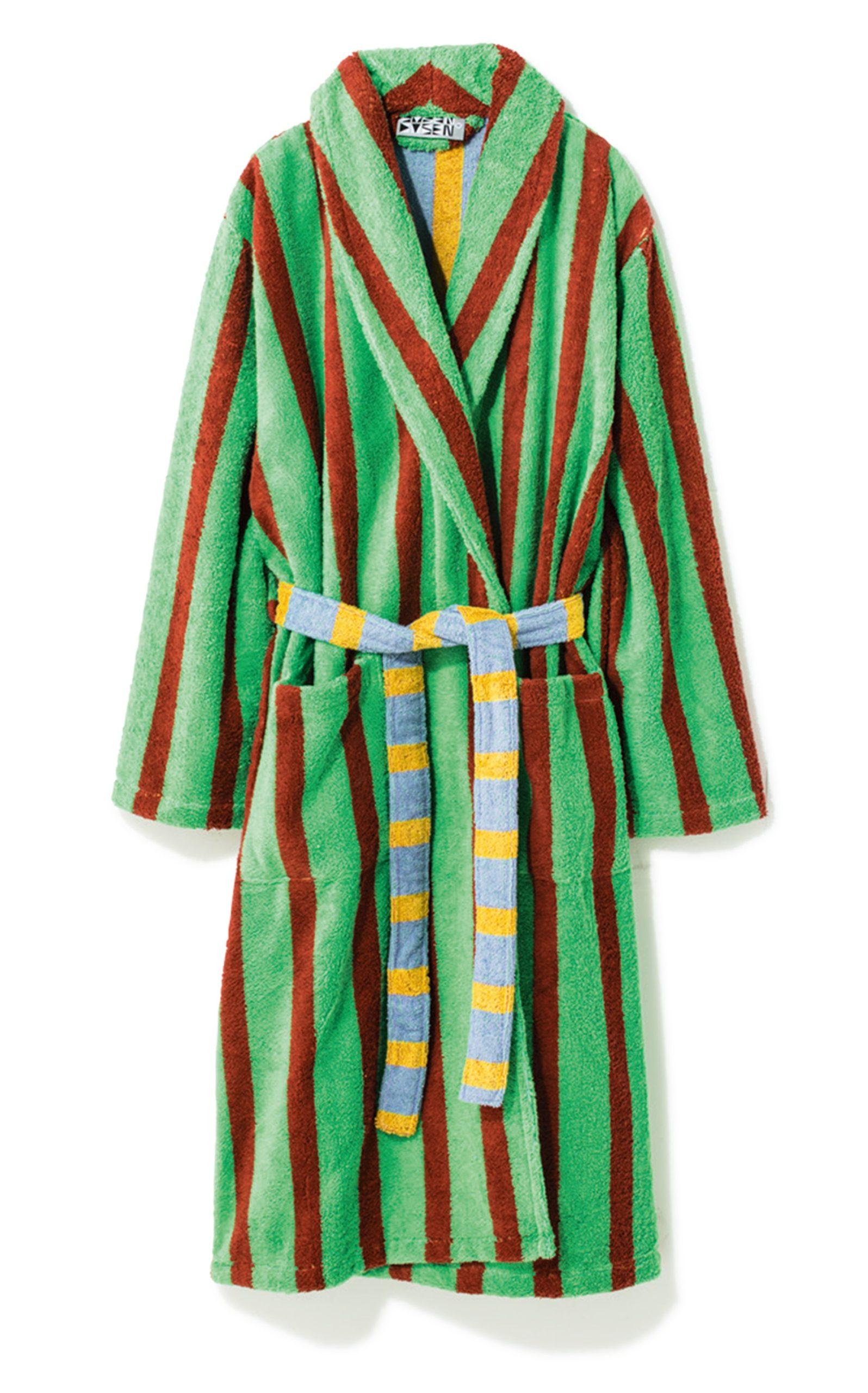 ① 大胆かつ鮮やかなプリントが目を惹くバスローブ