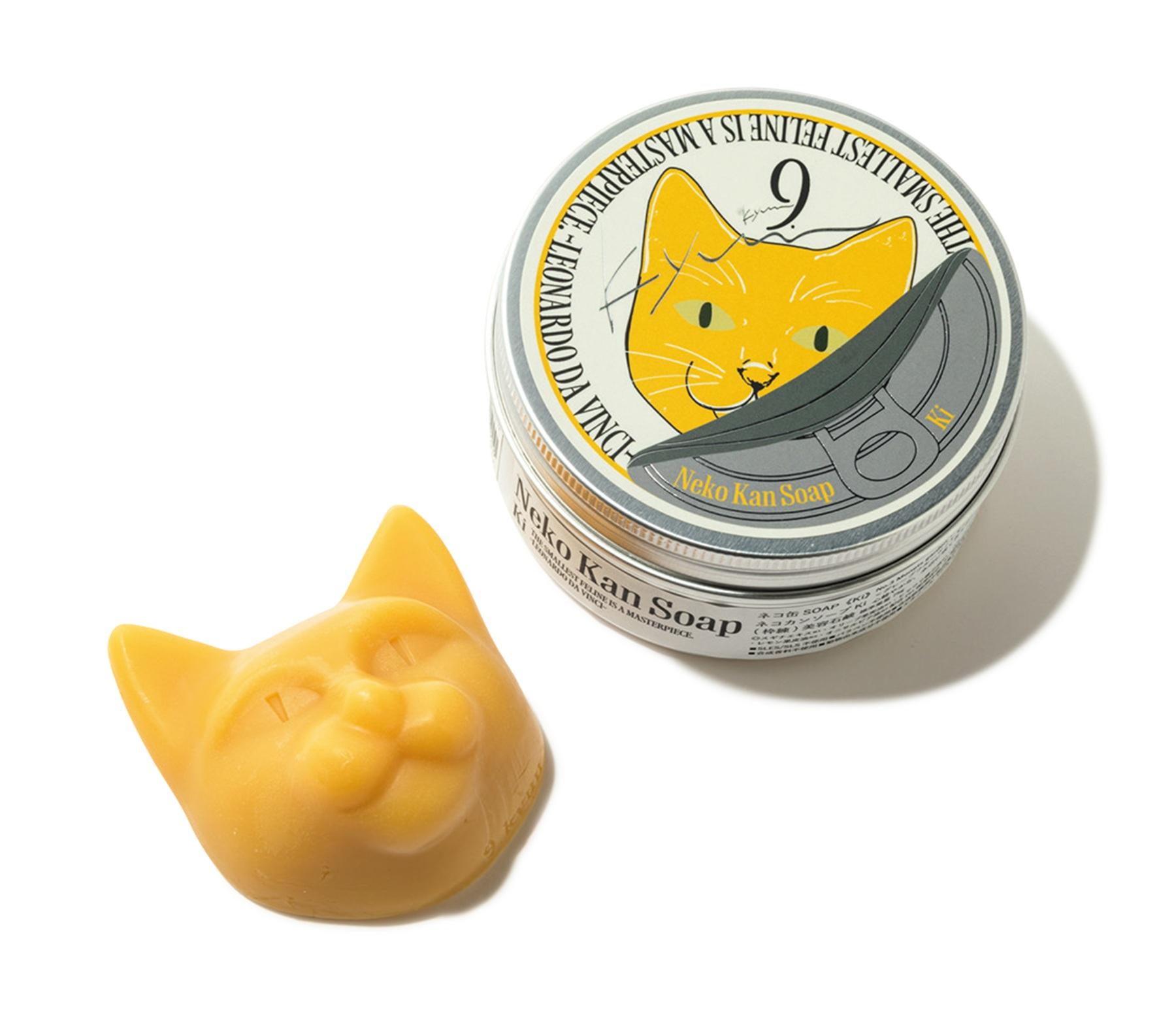 猫の顔をかたどったユニークな石鹸を発見! 自然由来成分を配合したナチュラルな処方で全身に使えるうえ、全9種類から香りが選べるのも嬉しい。使い終わった缶は、アクセサリーや小物の収納にも◎。約75g ¥2,420(9.kyuu info@9kyuu.com)