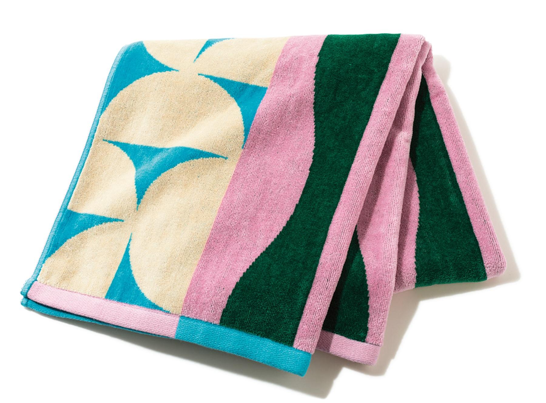オリジナリティ溢れる柄が魅力的なバスタオルは、ブランケットやソファカバー、枕カバーとしても使え、暮らしの中で幅広く活躍。ベロアのようなしっとりとした肌ざわりも心地いい。60×125cm ¥6,050(MYTONE TEL. 03-6416-1733)