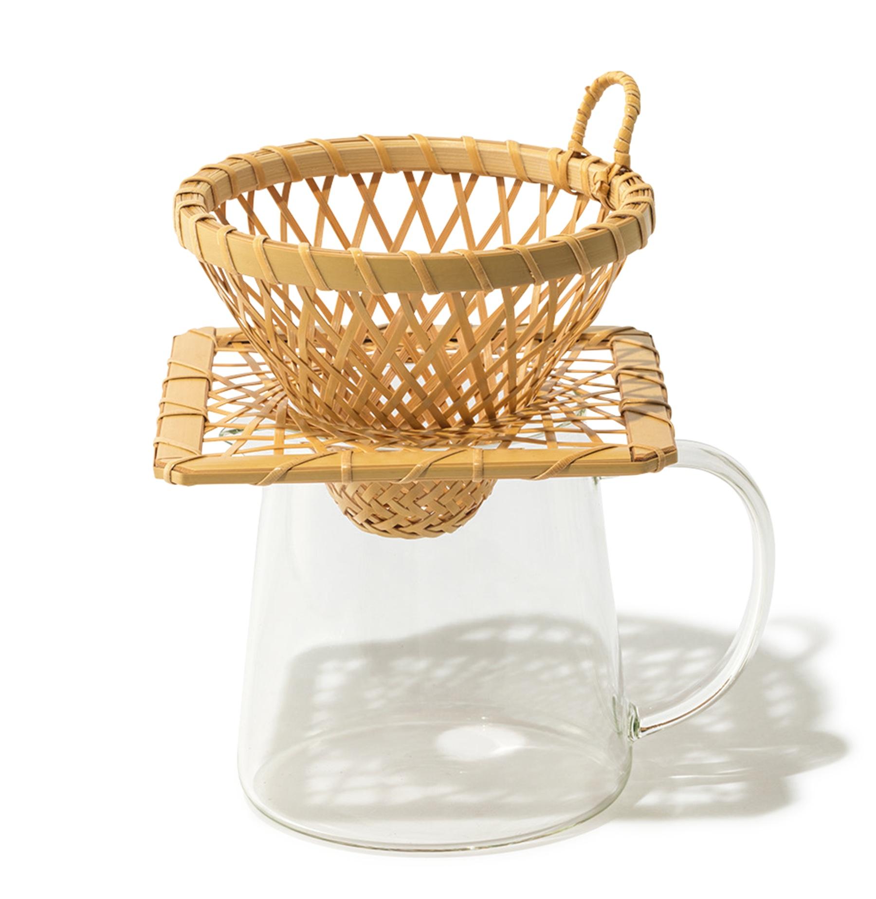 新潟県佐渡島の竹で作られた、造形美を追求した「輪弧編み」のコーヒードリッパー、ホルダーのセット。次第にコーヒー色に染まっていくという経年変化も味わえる。¥11,000(てから工房/本田竹店)