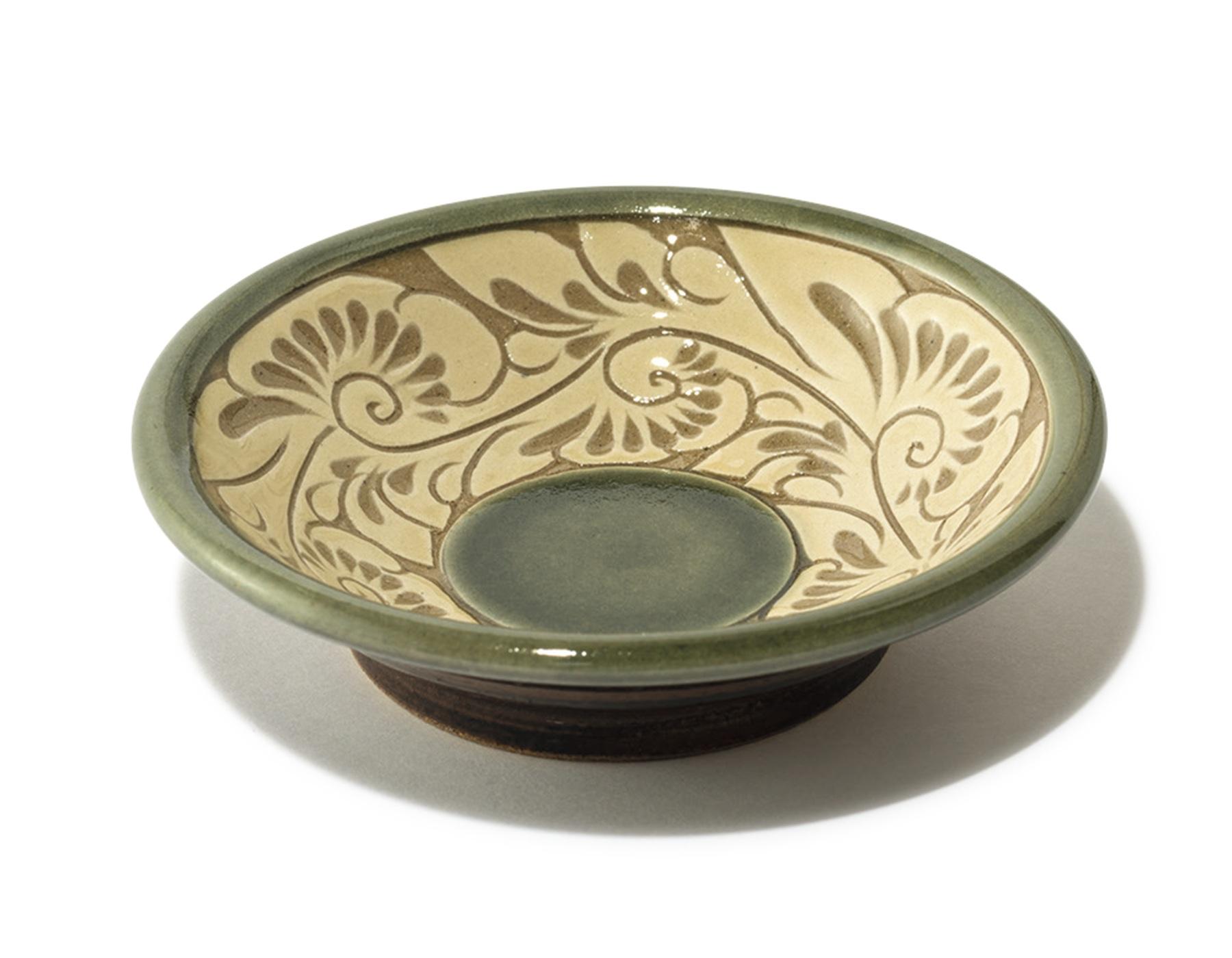 那覇の壺屋で約300年続く窯元が手がけるやちむんの小皿は、醤油や薬味を入れたり、おやつを置いたりと、さまざまなシーンで活躍。表情豊かな唐草模様は職人が一つずつ手彫りしたもの。φ11.5cm ¥3,850(育陶園)