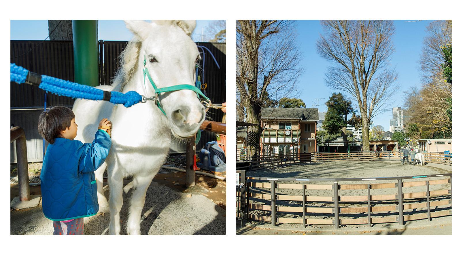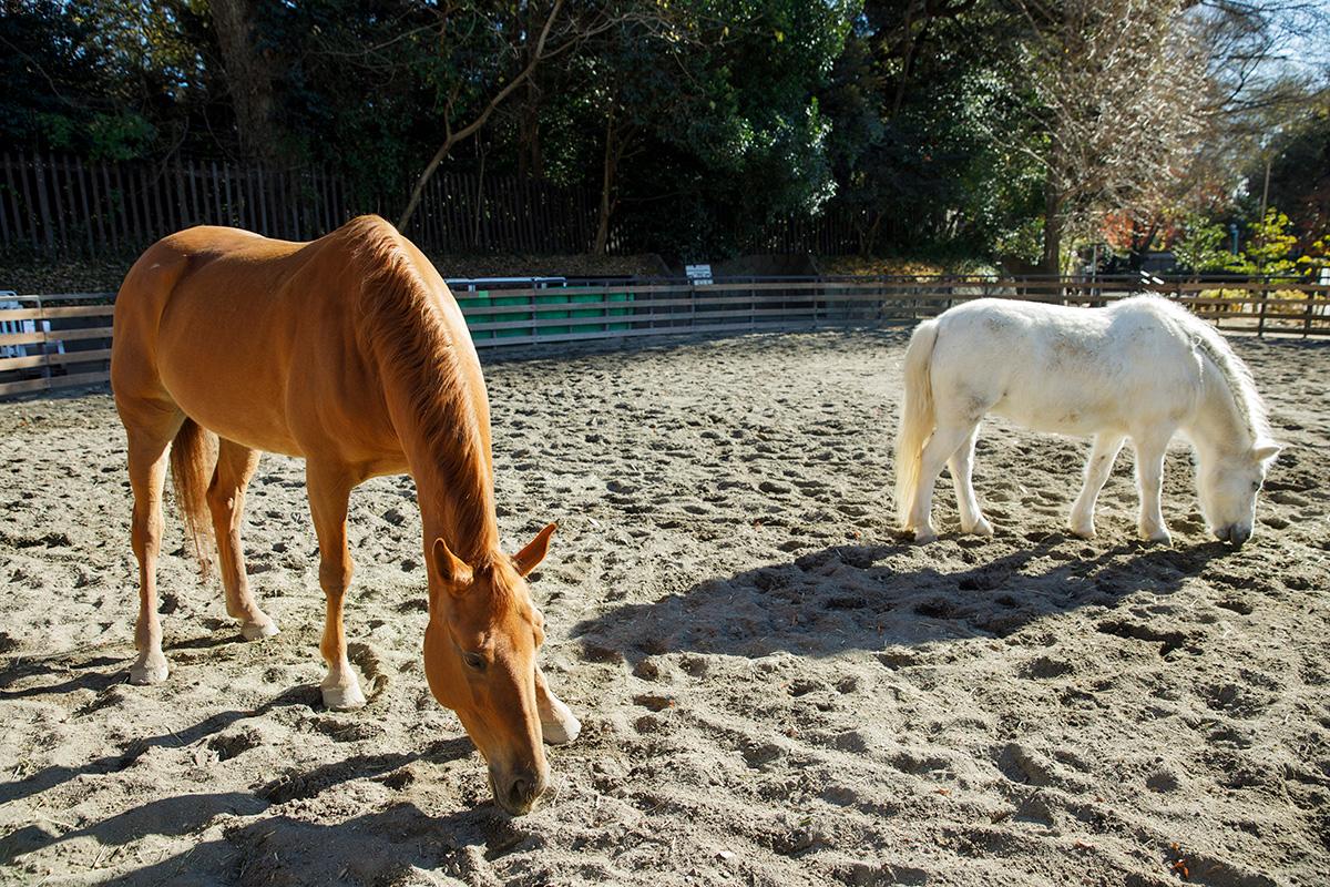 都内に住んでいる人でも知る人ぞ知る、でも行けば癒されること間違いなしの穴場スポット。ここで会えるのは、6頭のポニーや馬たち。引き馬乗馬は基本的に子どものみだけれど、ブラッシングや持参のニンジンをあげるのは、大人でもOK(時間は
