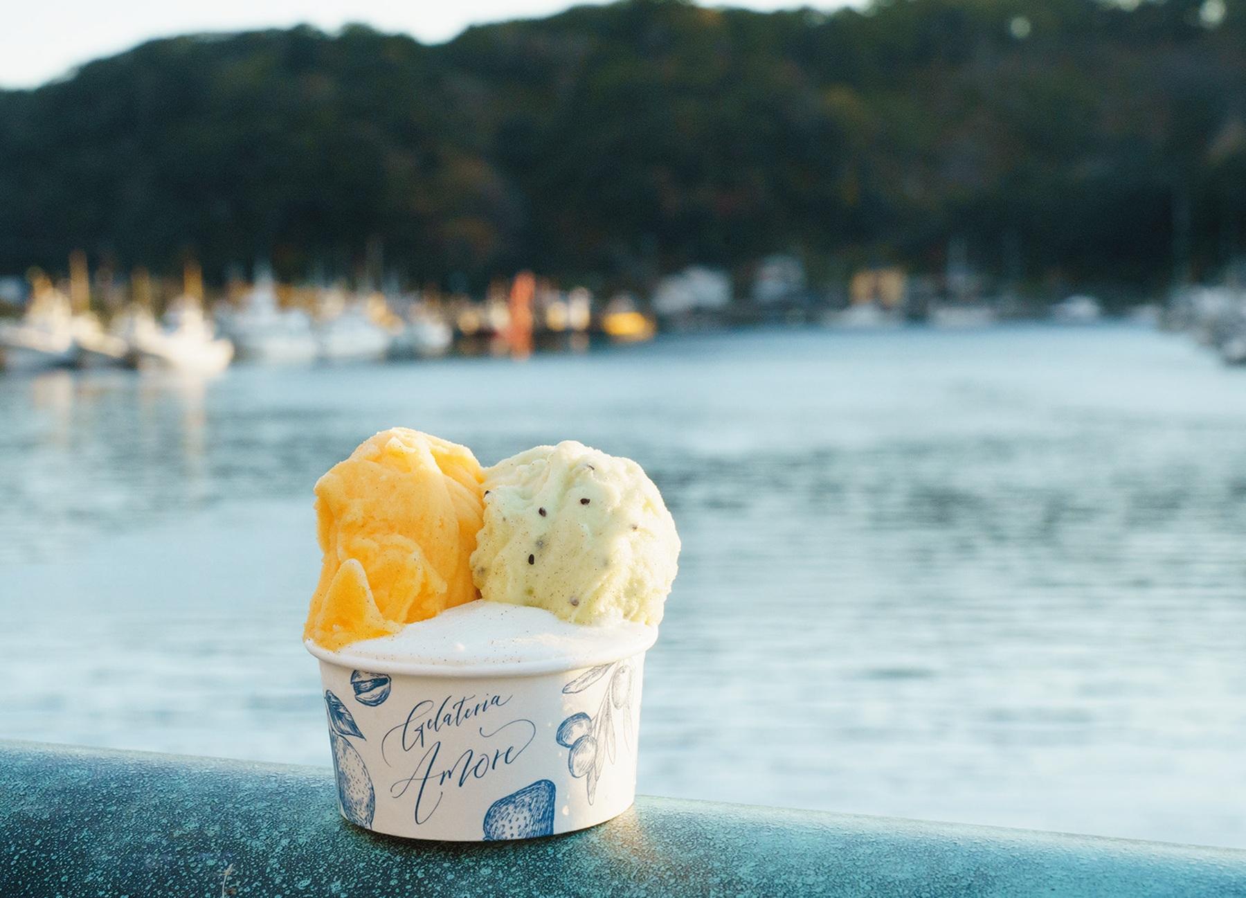「アクセスしづらいが故に独特の文化を維持し、他の町にはない魅力が残っているのを感じて」移住を決めたのが『Amore』の久保田翼さん。この町に何の店があったら嬉しいか考えて、行き着いたのがジェラート店だったそうで、本場イタリアに学び、旬の食材を使った日常のご褒美になるジェラートを提供する。