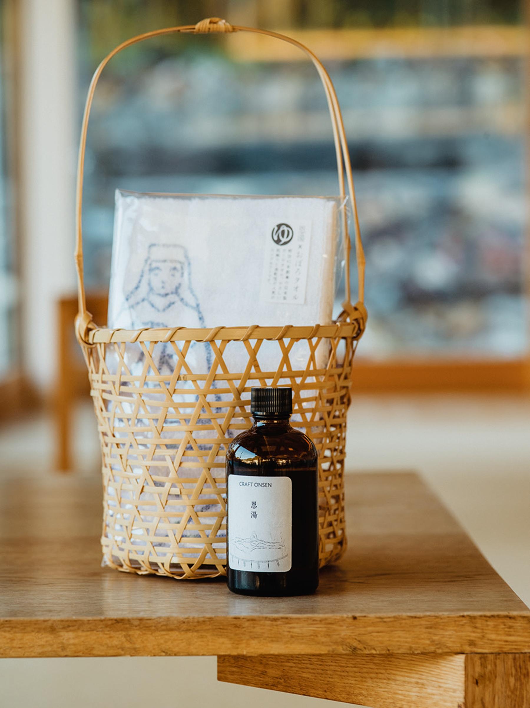 温泉タオル ¥1,100や、「クラフト温泉 恩湯(入浴用)」100ml(3~4回分)¥2,500 、湯巡りによさそうな竹籠 ¥4,980などオリジナルグッズも。