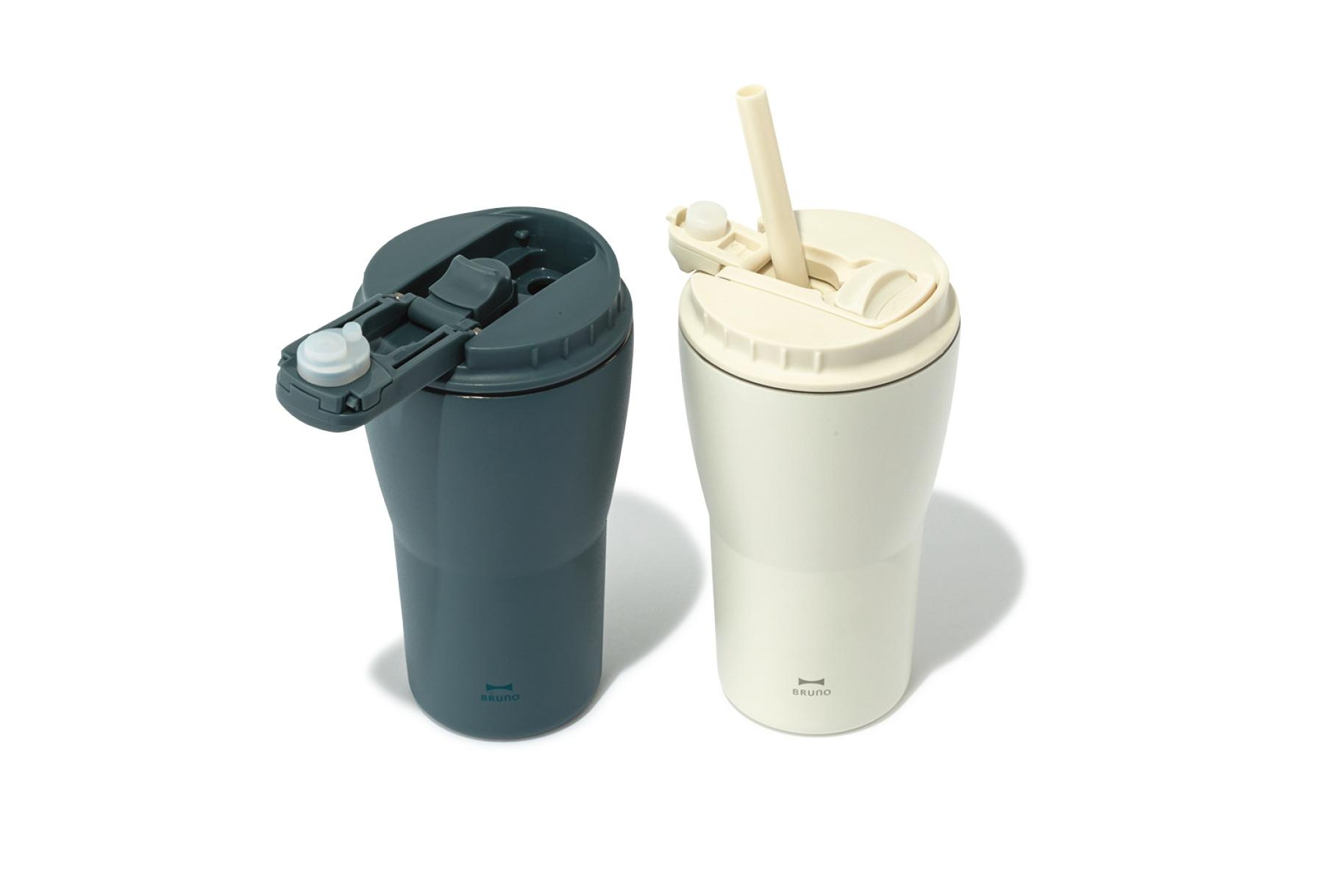 片手でも握れるスリムな形状とストロー付きのデザインで、ドライブのお供に最適。真空2重構造により、飲み物の適温をキープしてくれる。食洗機にも対応。φ9.5×H23cm 各 ¥2,530(ブルーノ/ブルーノお客様相談窓口 TEL. 03-5446-9511)