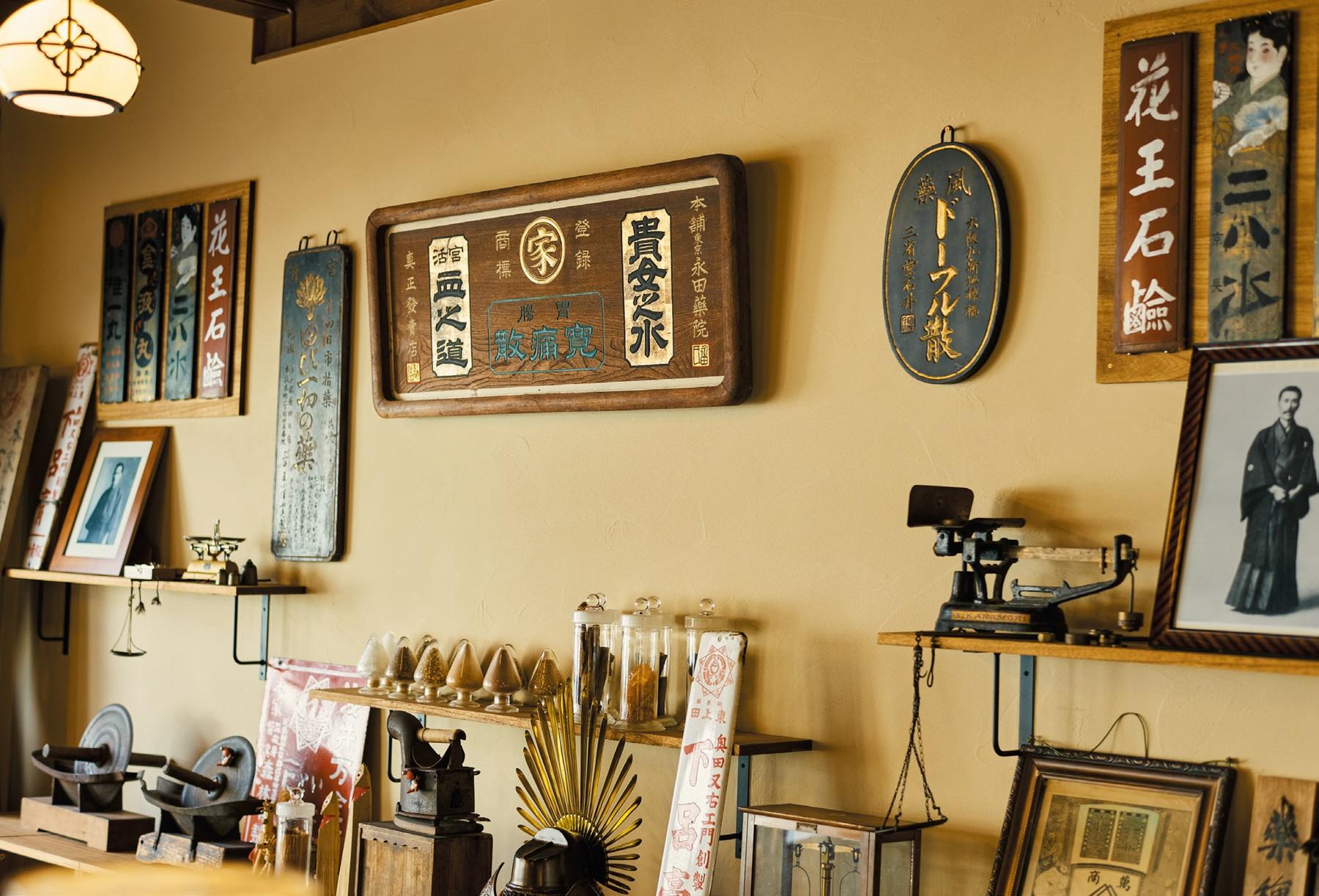 炎症を抑える黄柏、楊梅皮、ロジンなどを高温に熱したごま油で混ぜ、乾燥させたものを貼り薬にした「下呂膏」。巷の声に応えて家伝薬を市販薬にした昭和9年から今まで、変わらない製法で作られている。テーピング効果があり、カブれにくい美濃和紙を採用しているのも特徴。昔の調合道具や店看板などが飾られた趣のある店内も素敵。