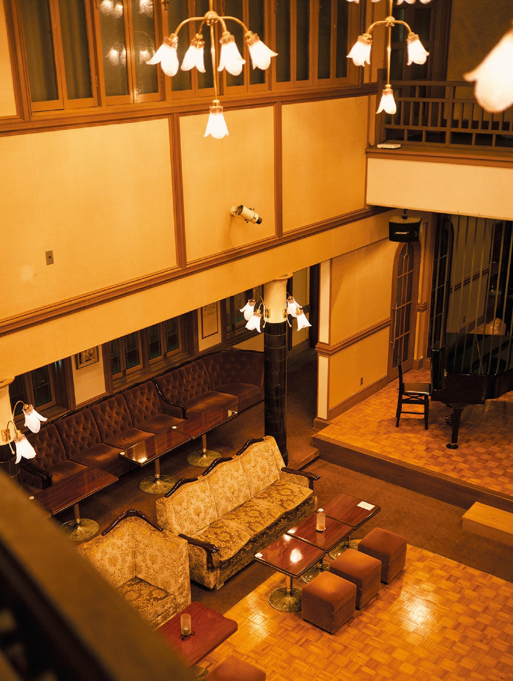 クラブ「ムーンライト」。20時を過ぎると花びらのようなシャンデリアが灯る。2階の「音楽室」と呼ばれるスペースから、ホールを見下ろすことができる。