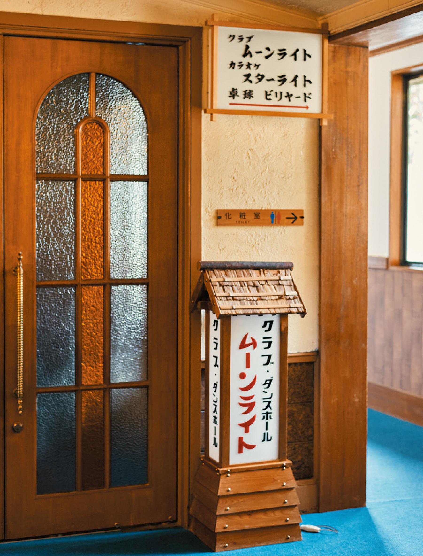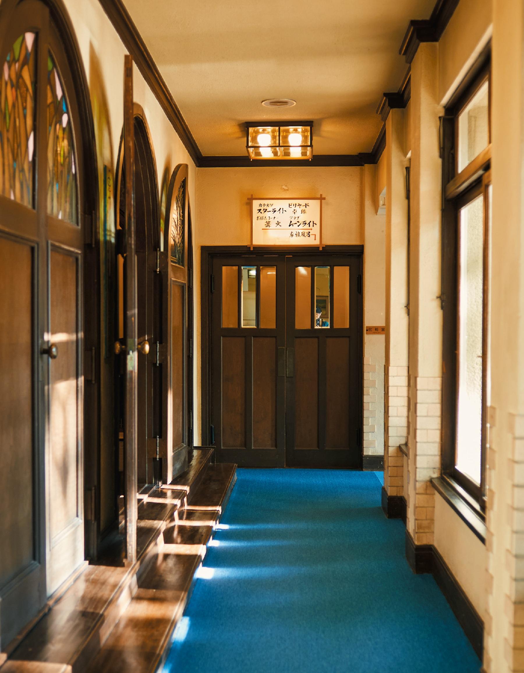 卓球場などがある娯楽棟へ続く廊下。青い絨毯と木造のドアのコントラスト、懐かしい面影が残る電灯も素敵。館内の何気ない場所も絵になるスポットばかり。