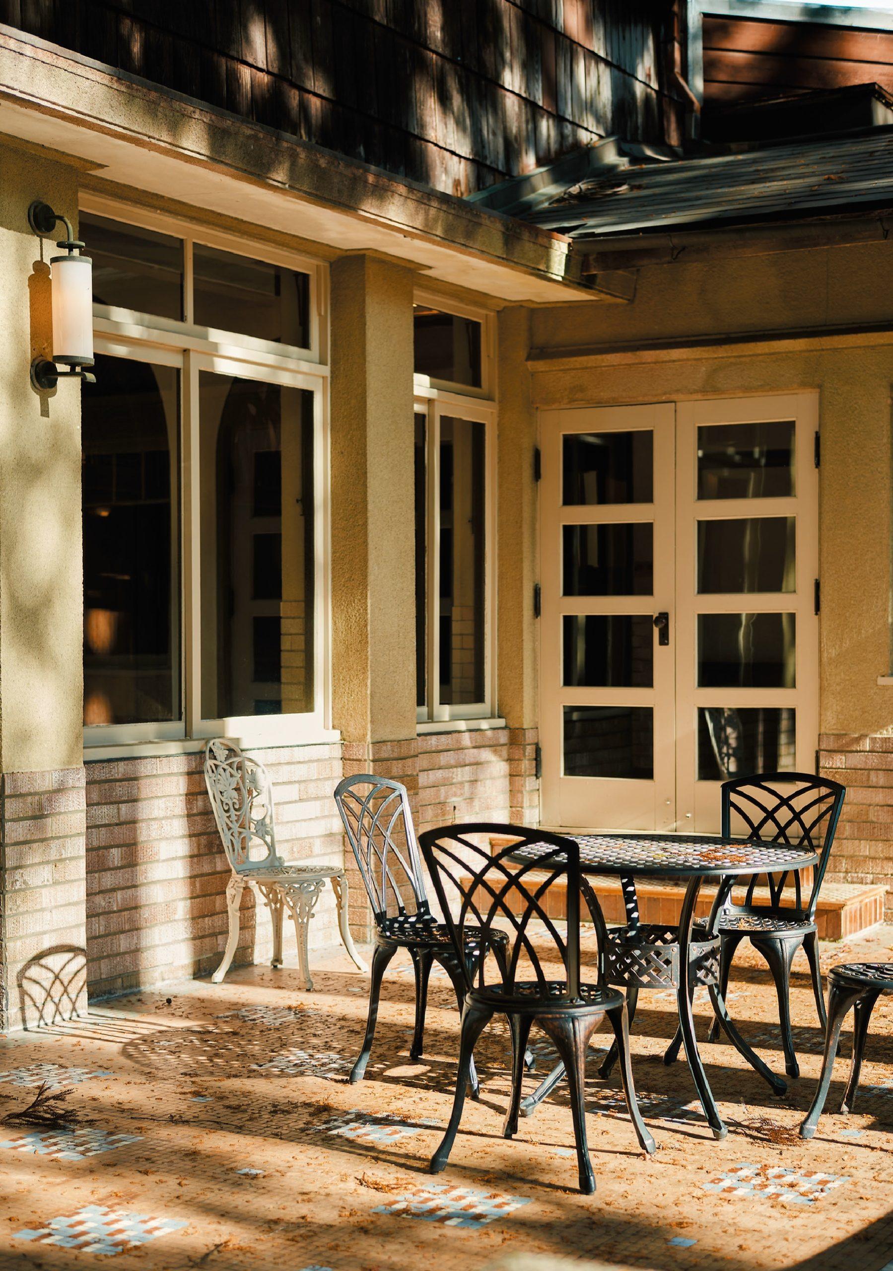 大浴場とは別の場所にある「山の足湯」。そのすぐそばには、創業当時の様子を残しているという洋風の休憩テラスが。