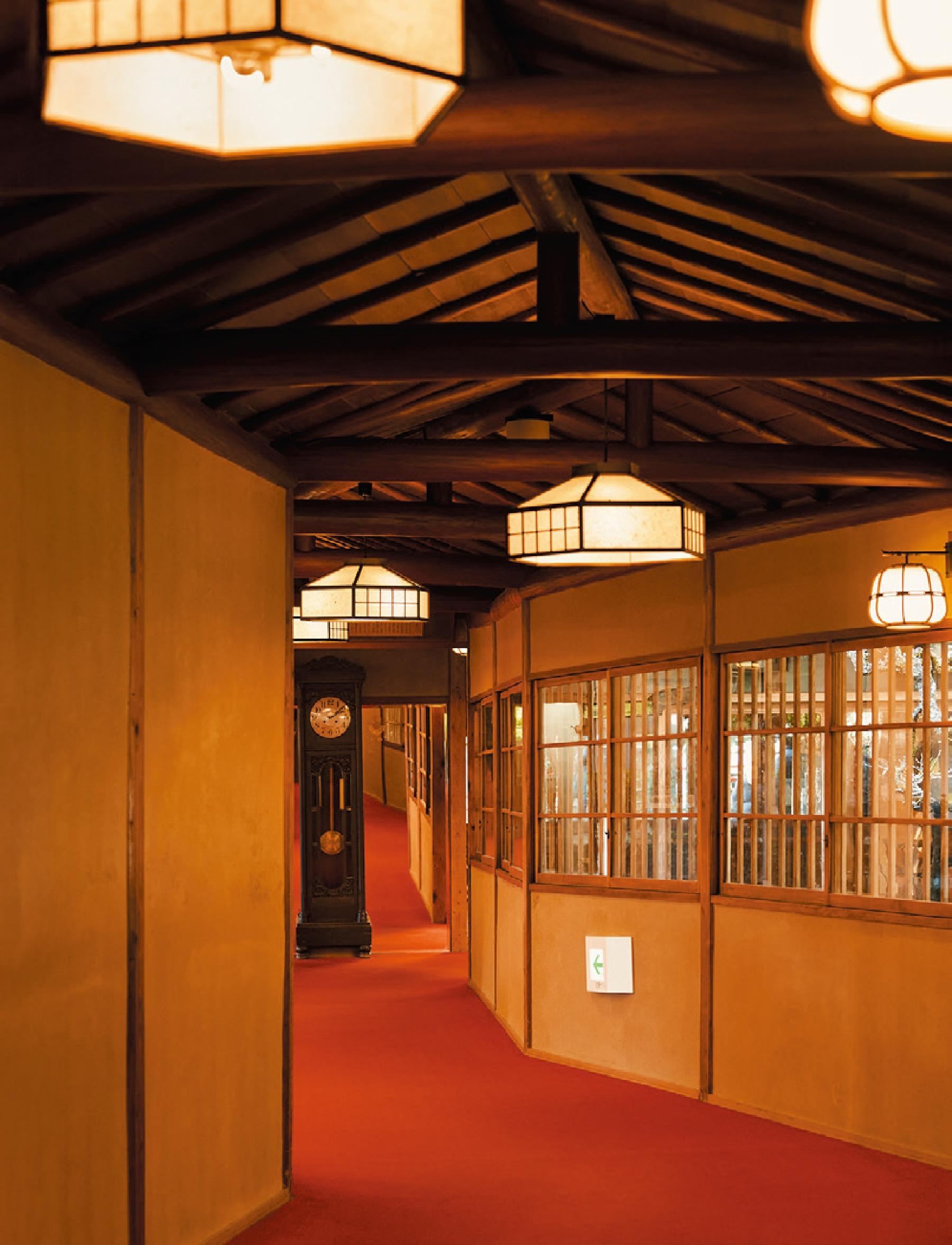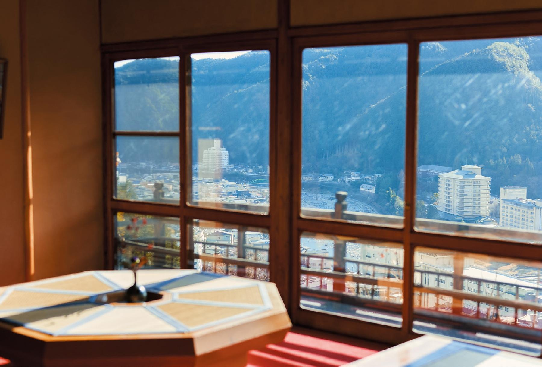 下呂富士とも呼ばれる中根山の中腹に、木々の合間を縫うようにして建つ「湯之島館」。国により有形文化財として登録されている本館に足を踏み入れると、そこは懐かしき昭和の世界。モザイクタイルを施したテラスや、草花が描かれたアール・ヌーボー風のガラス窓、渡り廊下の天井には梁を見せた和風の化粧屋根裏など、昭和6年の創業当時から変わらない和洋折衷な美しさがあちこちに宿る。