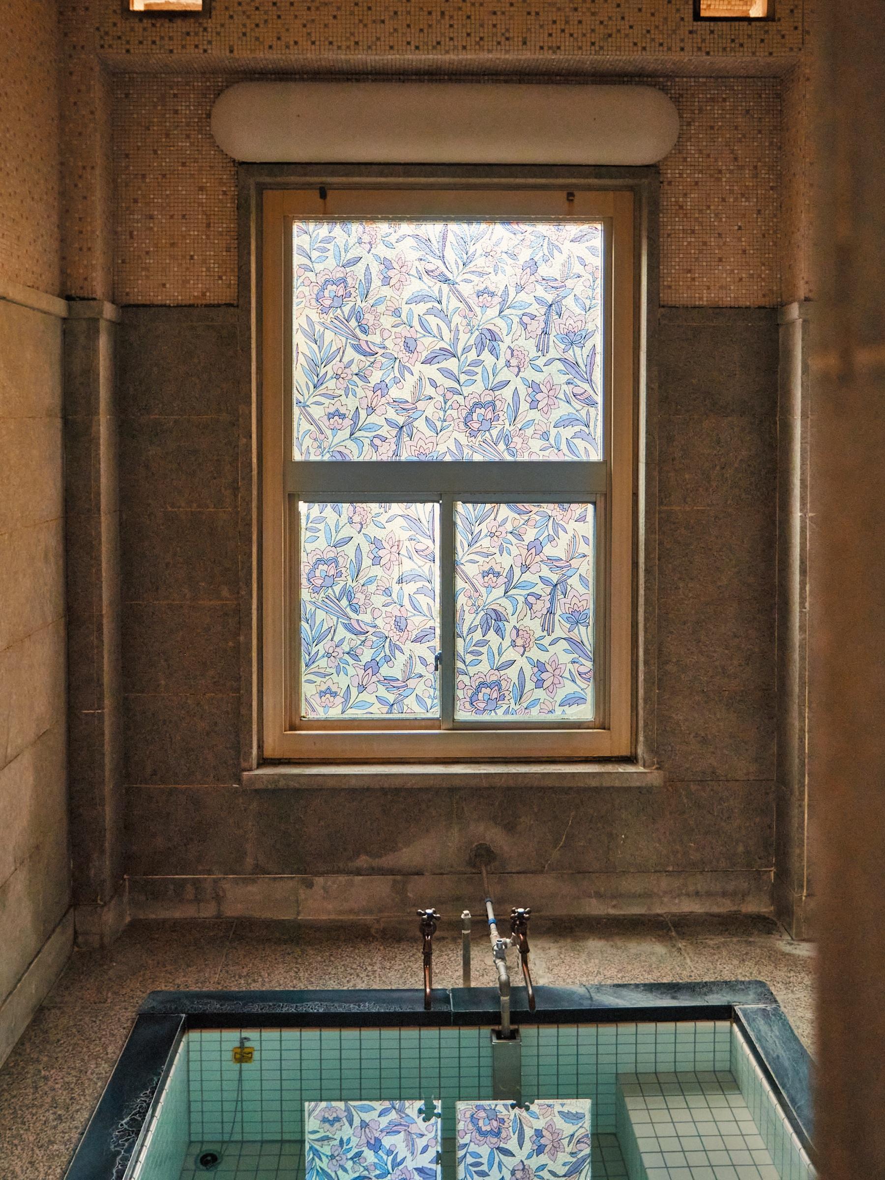 「銀嶺泉」「不老泉」「七宝泉」の3種類がある家族風呂。お湯は大浴場と同じく源泉掛け流し。脱衣所と浴場の雰囲気にそれぞれ個性があり、窓やタイルのデザインが可愛い。家族風呂は1組1回の利用。写真は「不老泉」。