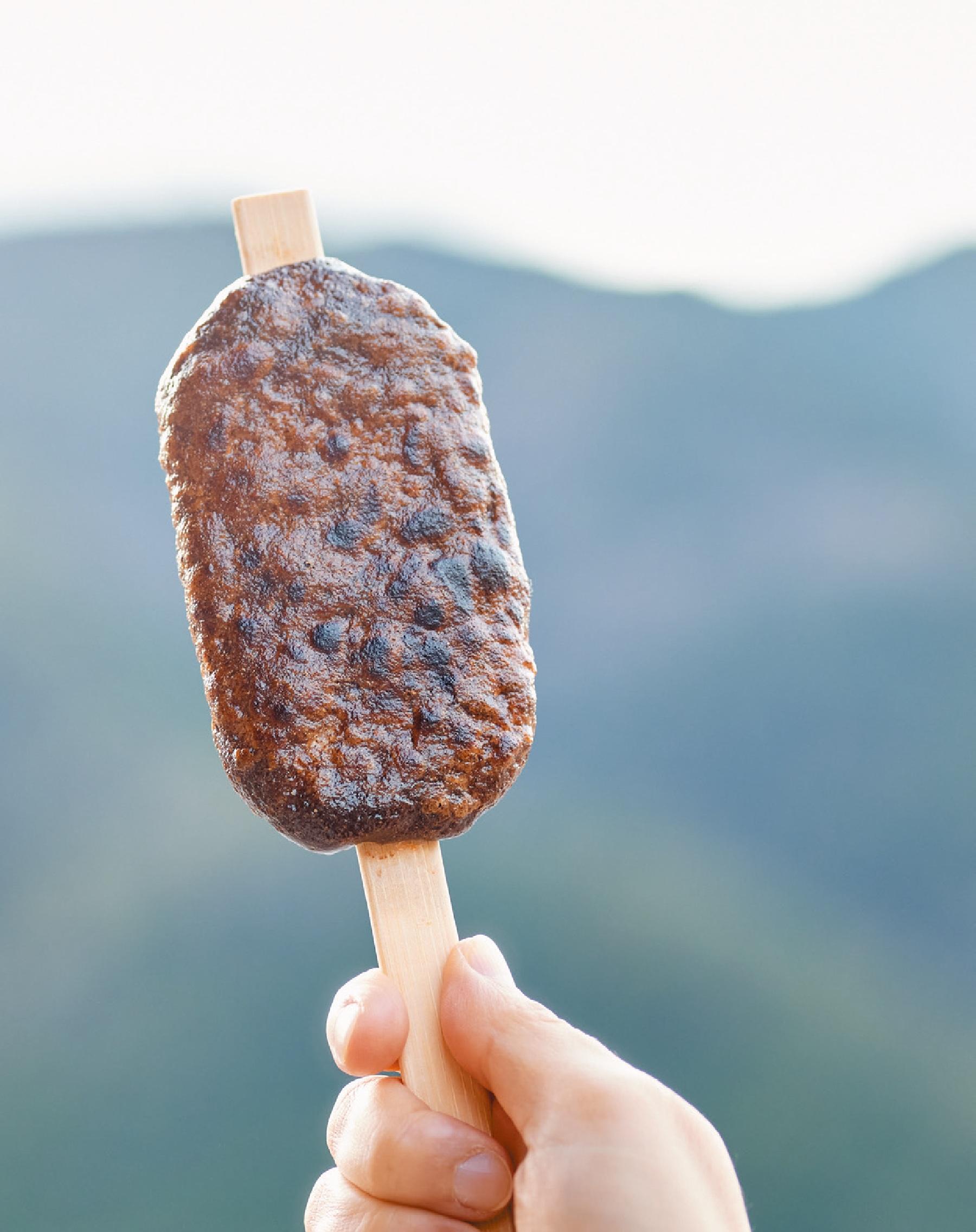 炒った地元産のえごまをミキサーにかけ、醤油と砂糖、酒を混ぜてタレに。わらじ型につぶしたご飯にたっぷり塗って焼くと、香ばしい匂いがふわり。コク深さも増しておいしい。五平餅¥300。