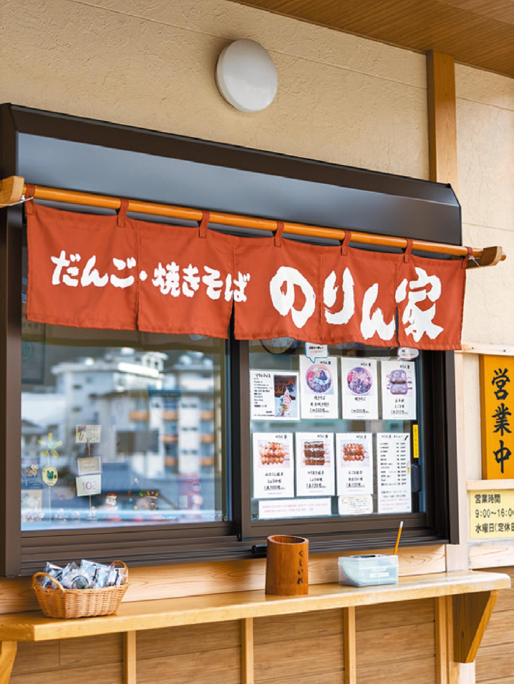 五平餅をはじめ、お団子や焼きそば、ソフトアイスなど、小腹を満たすのにベストなラインナップが並ぶ。五平餅は冷めてもおいしい仕上がりを求めて試作を重ねた自信作。「老若男女、みんなに喜んでもらえるものを」という店主・松田紀夫さんの想いが端々から伝わる温かいお店。