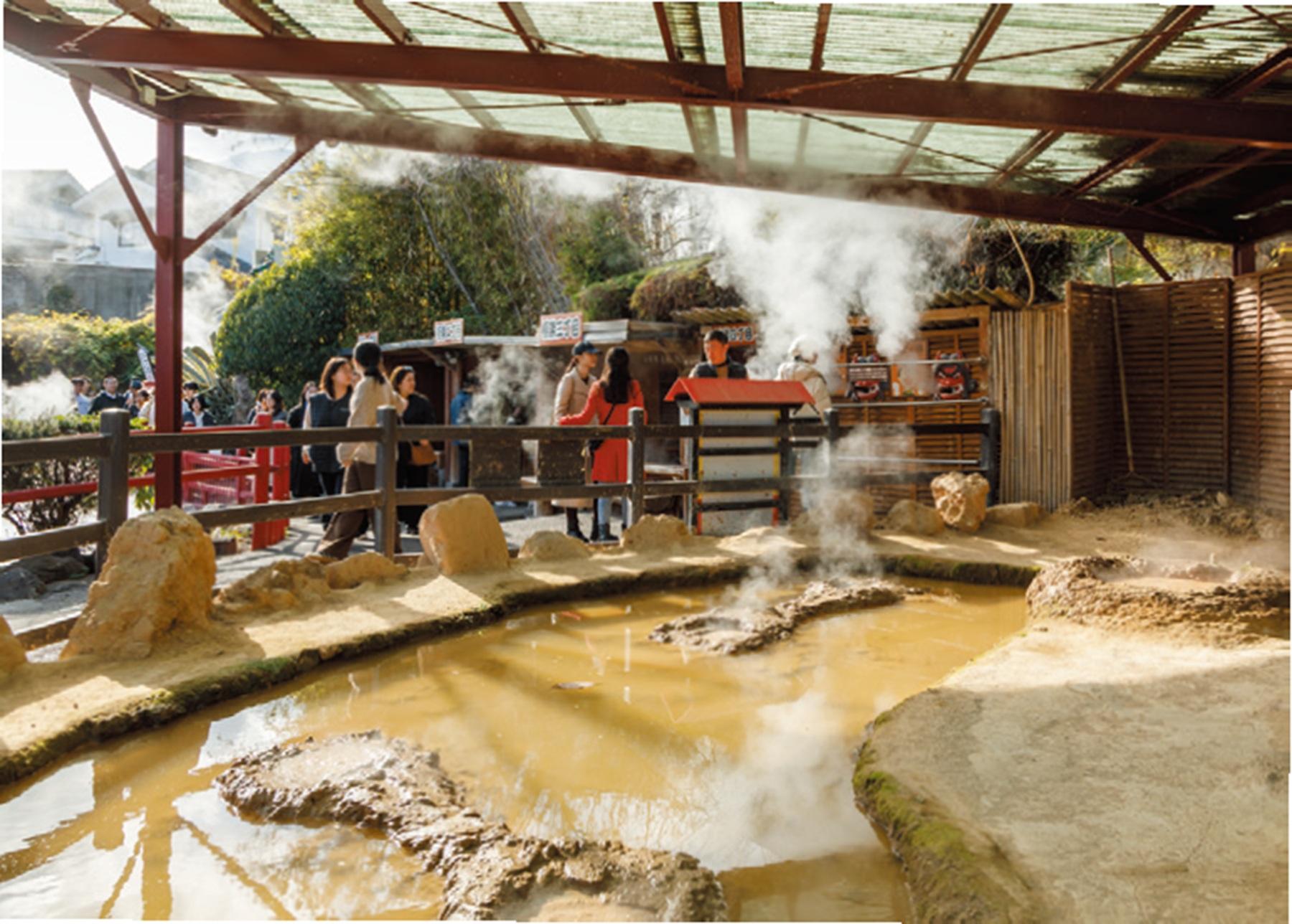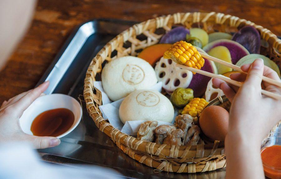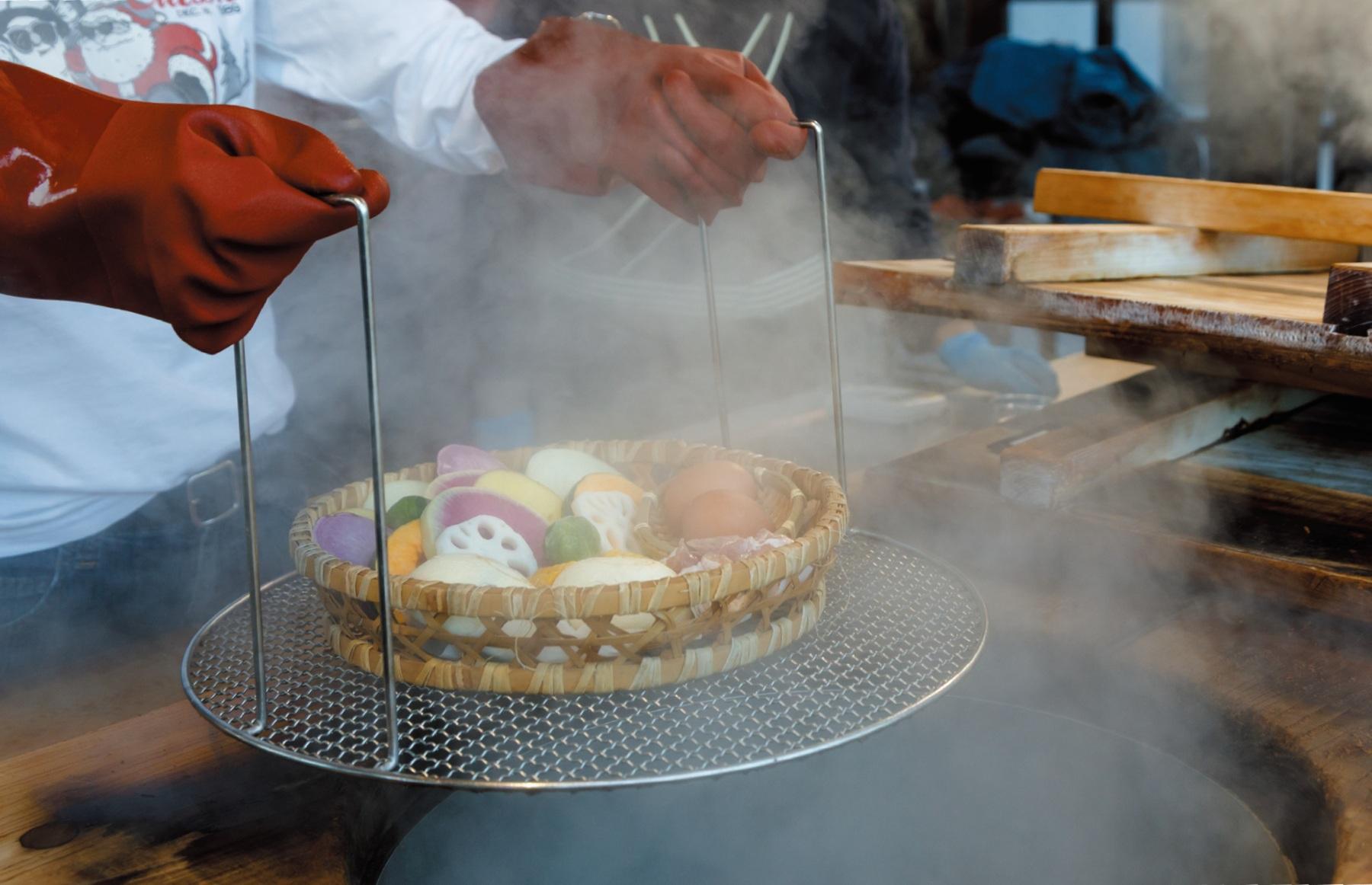 メニュー決めから蒸し釜入れ出しまでの“地獄蒸し”の一連の流れを体験できる代表的施設で、みんなでトライする姿は調理実習のようなほっこり感。食材はなるべく大分県産にこだわるほか、地獄蒸しとの相性◎な品種がセレクトされているため美味しさもひとしお。たとえば野菜はしっとりし、卵はプリプリに、豚まんはもちもち食感に仕上がる。