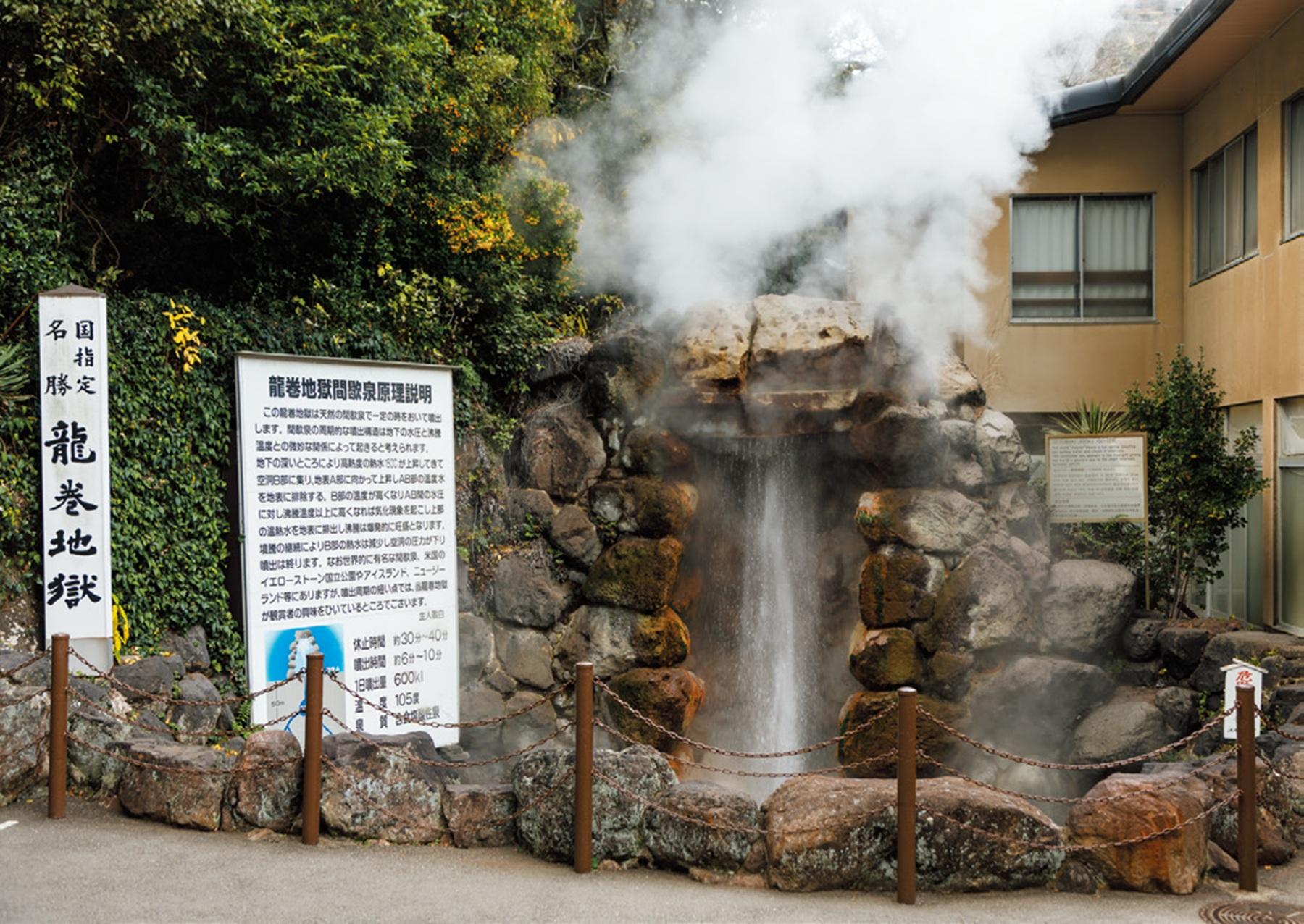 地下に溜まっている温泉が沸騰し、一定の間隔で、限られた出口から勢いよく噴出する“間欠泉”。「龍巻地獄」は国指定名勝であるとともに、別府市指定天然記念物でもある。約30~40分間隔、約6~10分の間105°Cの温泉が噴出し続け、この間隔の短さは世界的にも珍しいことで注目されているそう。住所:別府市野田782