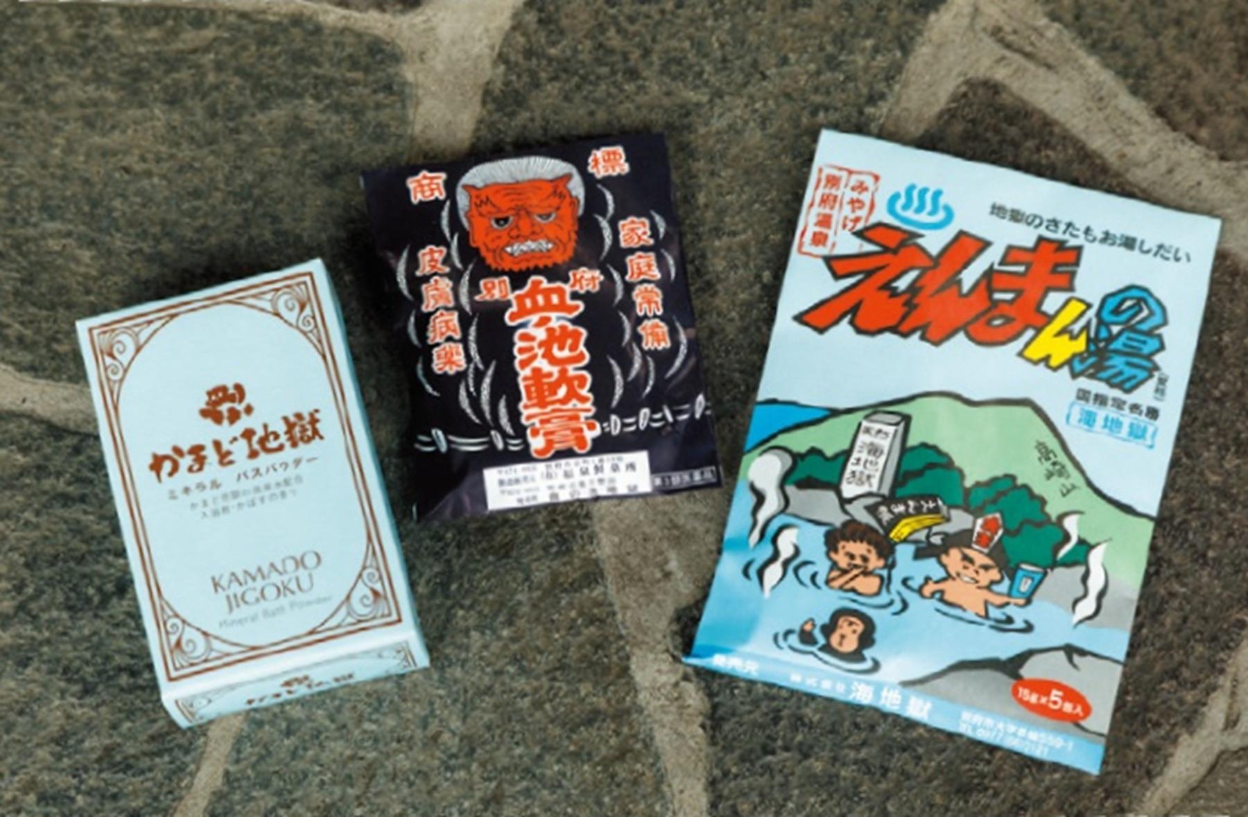 オリジナルグッズをはじめ、施設ごとに取り扱いが異なるので、欲しいものは各所ですかさずゲットしていこう。右・「海地獄」の温泉水を特殊加工で粉末にした薬用浴剤。現地さながらの青色風呂を堪能して。「えんまんの湯」5袋入り ¥560 中・「血の池地獄」の鉱泥を主成分に作られた赤茶色の軟膏。アトピーやひび、あかぎれに効能あり。「血ノ池軟膏」22g ¥1,500 左・「かまど地獄」の温泉水を配合した、塩化物、硫酸、炭酸水素を含む入浴剤。大分特産・かぼすの香り。「かまど地獄 ミネラル バスパウダー」3包セット ¥1,200