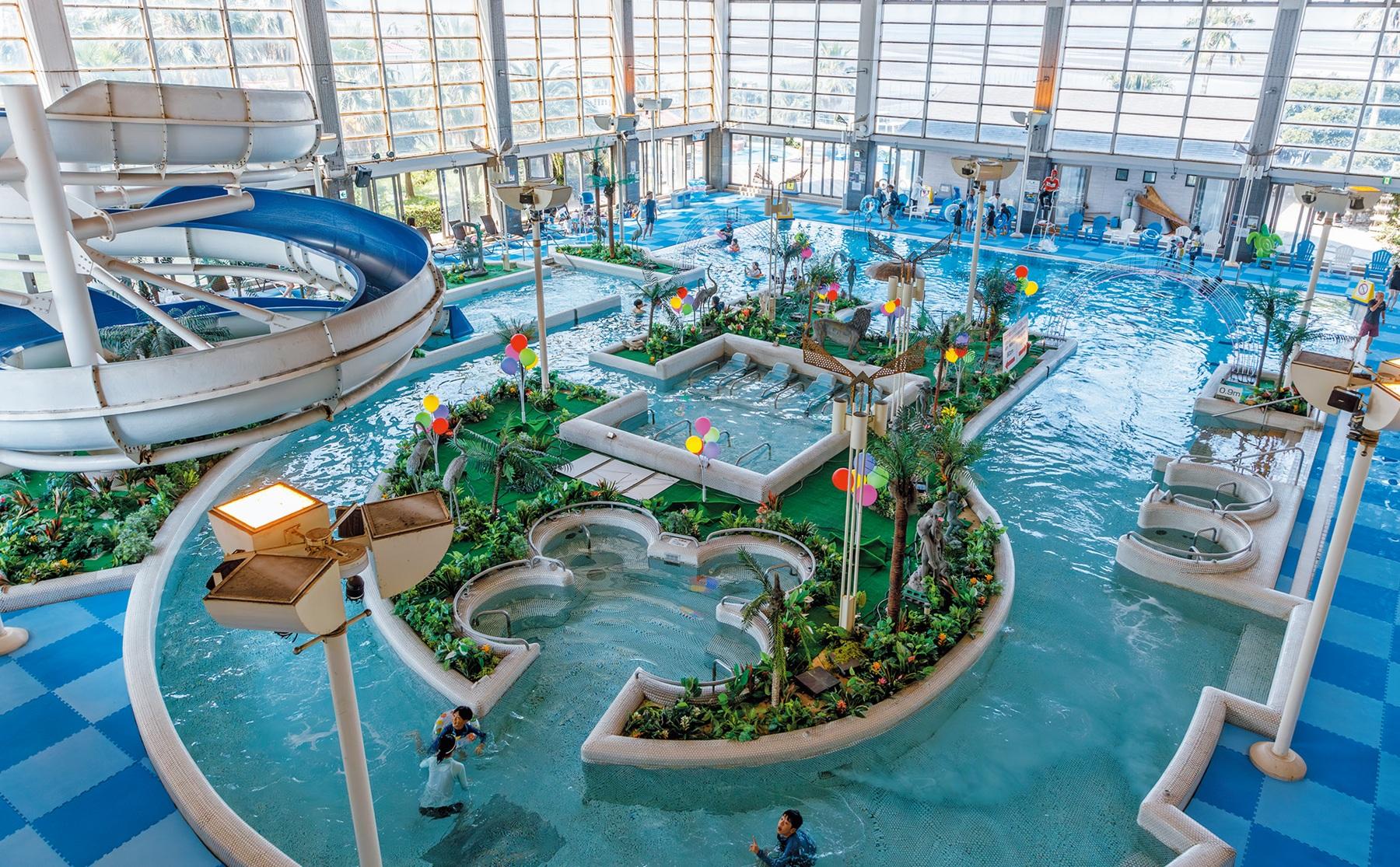 屋内プール「アクアパーク」は天気を気にせず遊べるところがポイント。流れるプールやウォータースライダーなどアトラクション要素も満載。