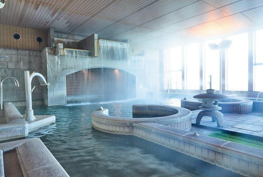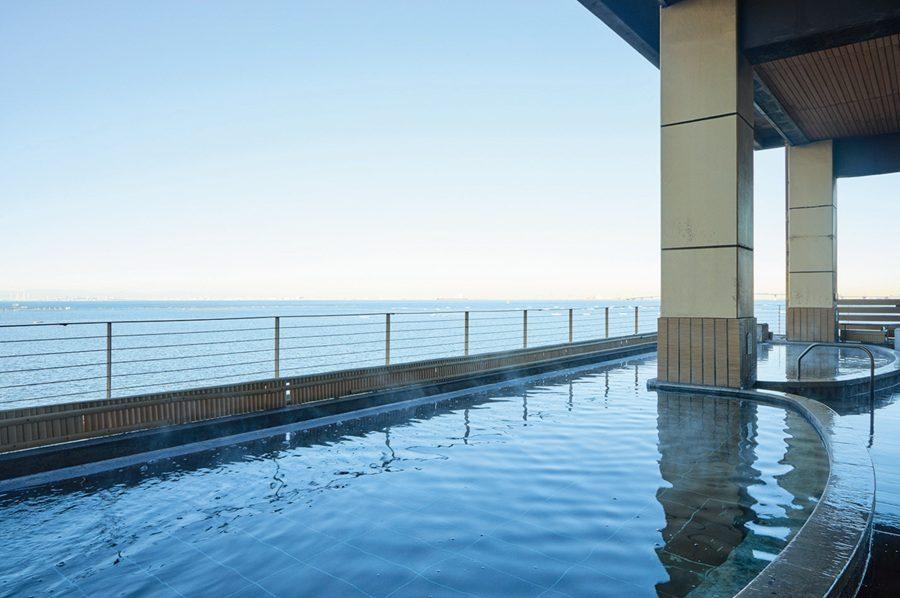 敷地内で自噴している、神経痛や疲労回復にいいとされる源泉天然温泉が人気で、バリエーション豊かなユニーク風呂を楽しむことができる。スパ棟にある女性用の大浴場「富士の湯」は、あまりの広さと奥行きに圧倒されること間違いなし。まず、「乙姫の湯」と名付けられた内湯は、石の灯籠や橋にどこか和の趣を感じる。大きな窓があり開放感も抜群! 壁面から噴き出すジェット流が血行を促進する「うねりの湯」や、1億5000万円の純金風呂、ゆったりと入れる寝湯、ヒノキの香りがするお湯など多様なラインナップを前に、次はどれに入ろうか…と忙しい。また、外湯の「うみほたるの湯」や「ハーブ湯」は、東京湾を一望できる贅沢なロケーションにうっとり。昼は青い海、日が落ちた後は夜景に目を奪われ、思わず長湯になってしまうかも。