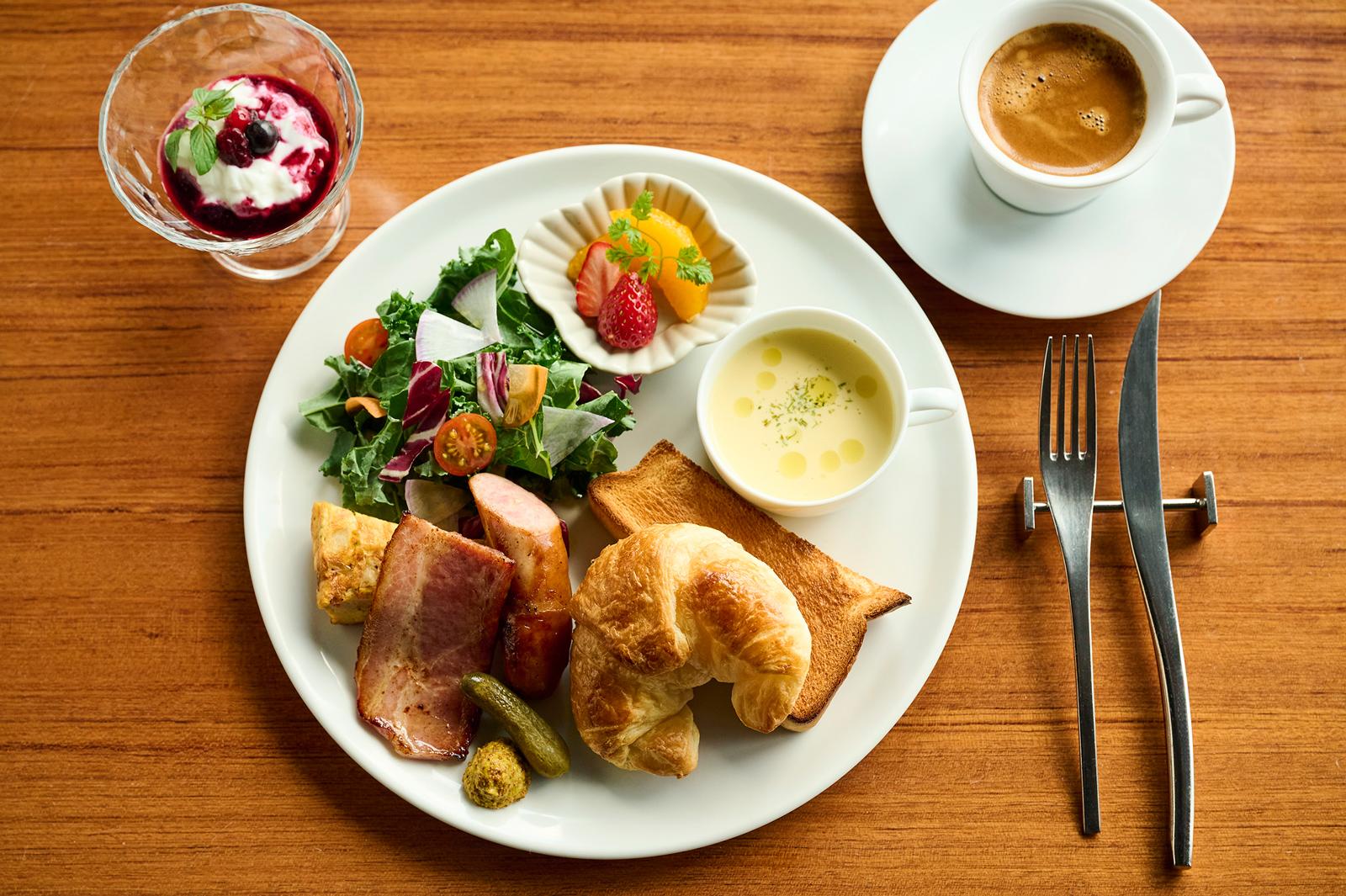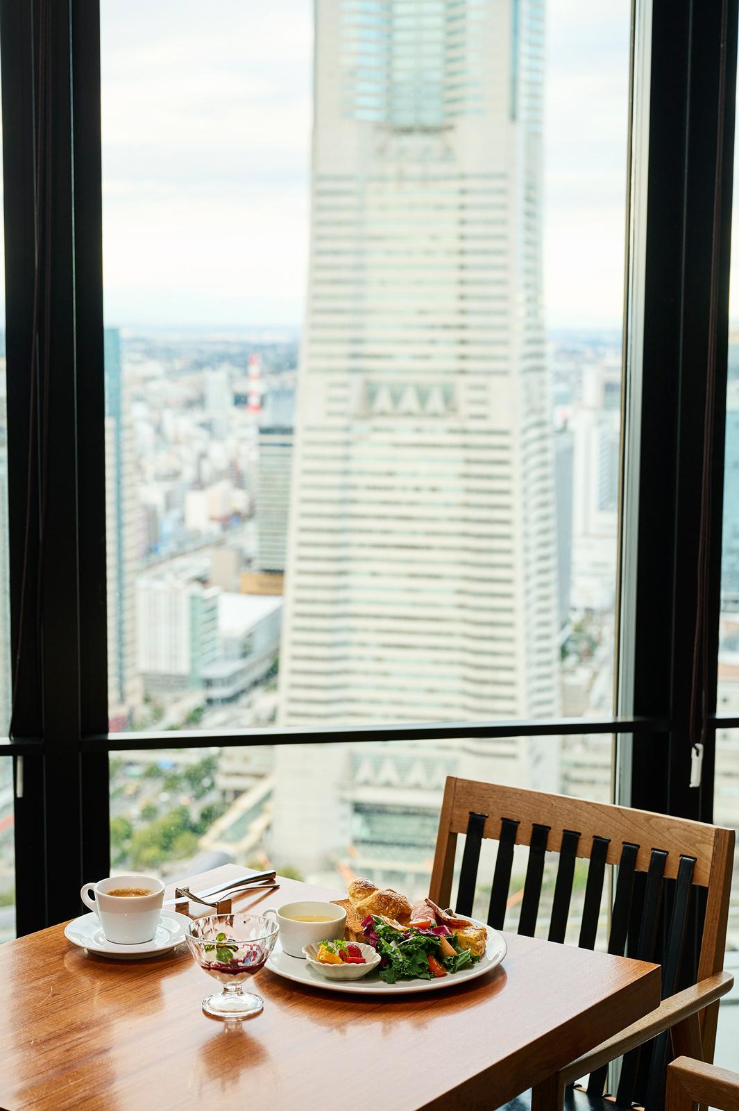レストランが位置するのは、みなとみらい側。夜とはまた違うビル群や港の景色を眺めながら、優雅に味わう朝食は格別。メニューは洋食と和食から選べて、洋食はサラダや卵料理、パンなどがバランスよくワンプレートに。ヨーグルトやコーヒーなどドリンクがつくのも朝に嬉しい。