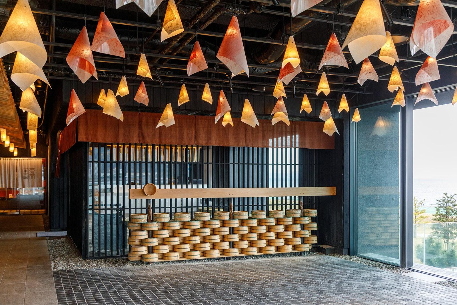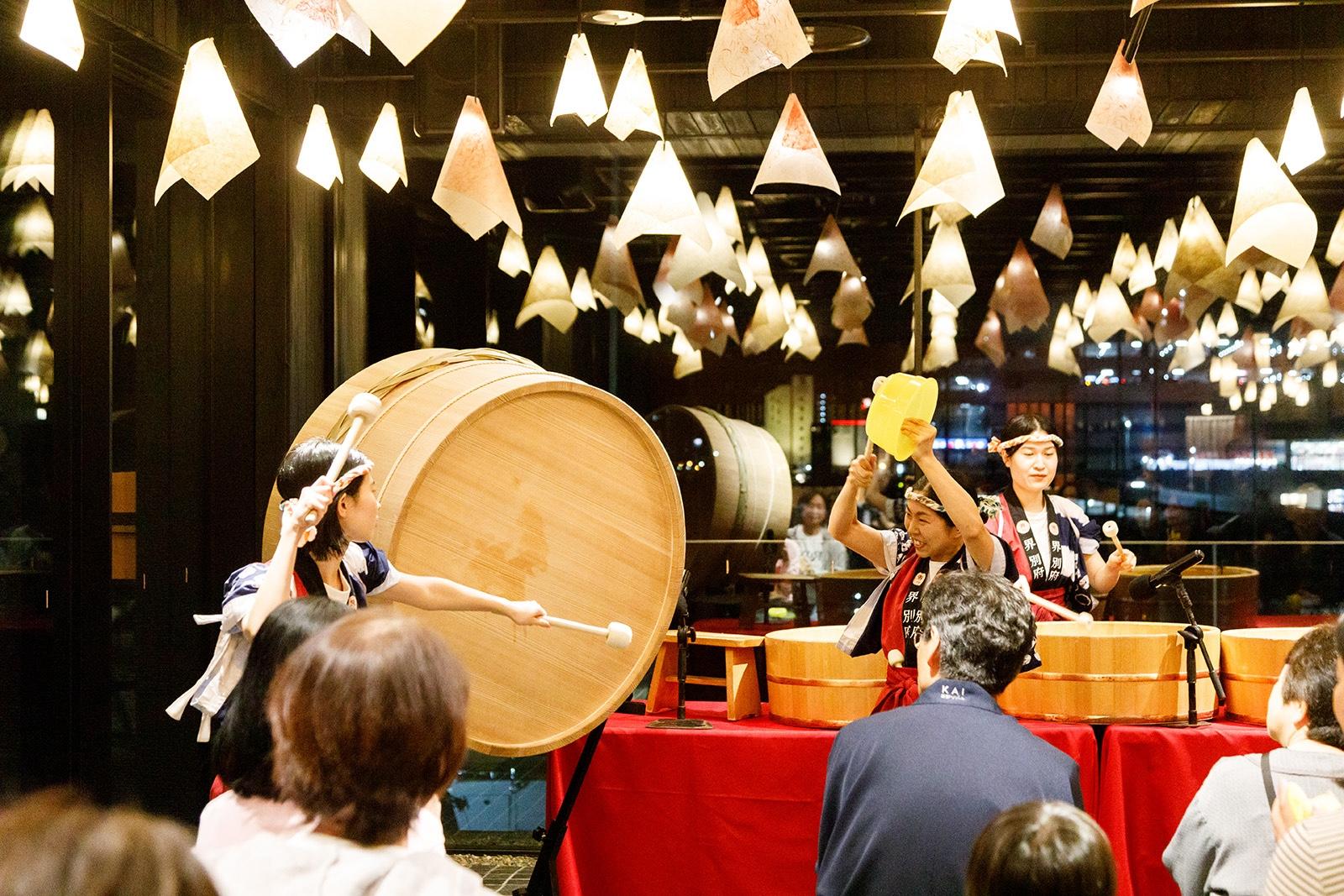入り口からエレベーターで上がり、開いてすぐに迎え入れてくれるのは「湯の広場」。別府湾からの優しい海風がそよぐ開放感あふれる空間で、一面の桶装飾や石畳、温かな電灯など、一気に別府の街並みや温泉街の世界観に誘ってくれる。チェックイン後は手湯、足湯を楽しむこともできる、居心地の良いパブリック空間だ。