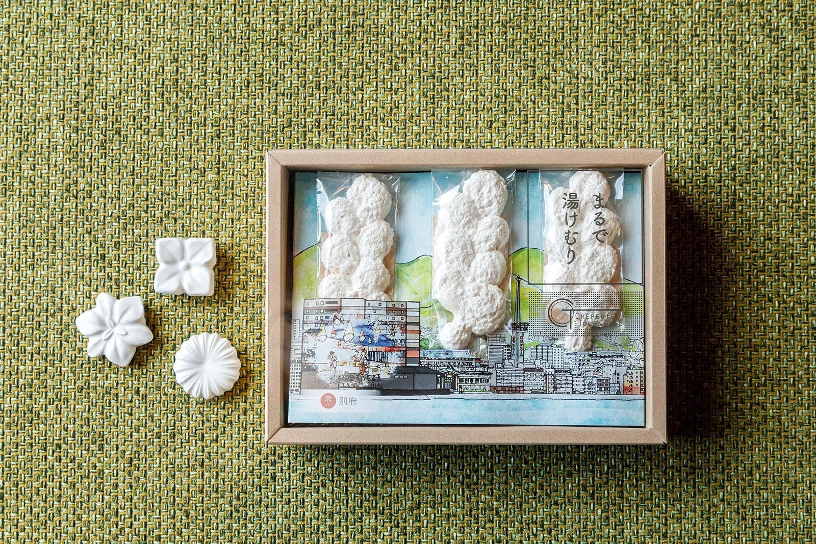 フロントの横にはショップが。お菓子から伝統工芸品までズラリと揃い、選りすぐりのお土産まで買えちゃいます。おすすめは、界 別府の温泉の壁と同じデザインで、臼杵焼の箸置き。滑らかな乳白色が美しく、野菊やヤマボウシなど、好きな紋様を選んでみて。2つで¥1,881 サクサク食べる手が止まらない、ホワイトチョコレート、ココナッツのフレーバーを合わせたメレンゲ菓子「まるで湯けむり」は、別府市内のクレープ屋さん『クレープリー・トゥルヌソル』が製造しているもの。ここでは界 別府オリジナルパッケージで購入できる。15枚入り ¥1,650