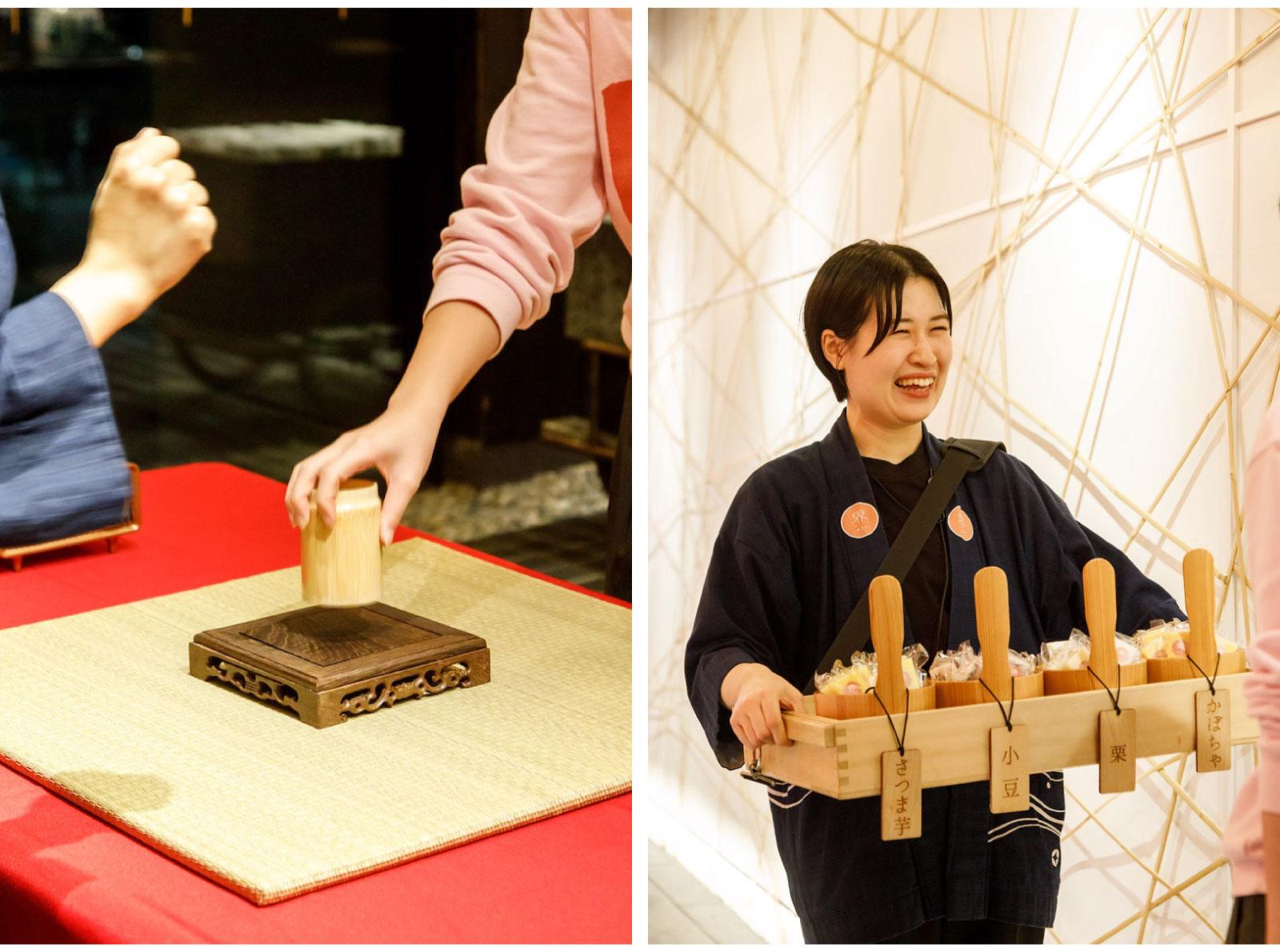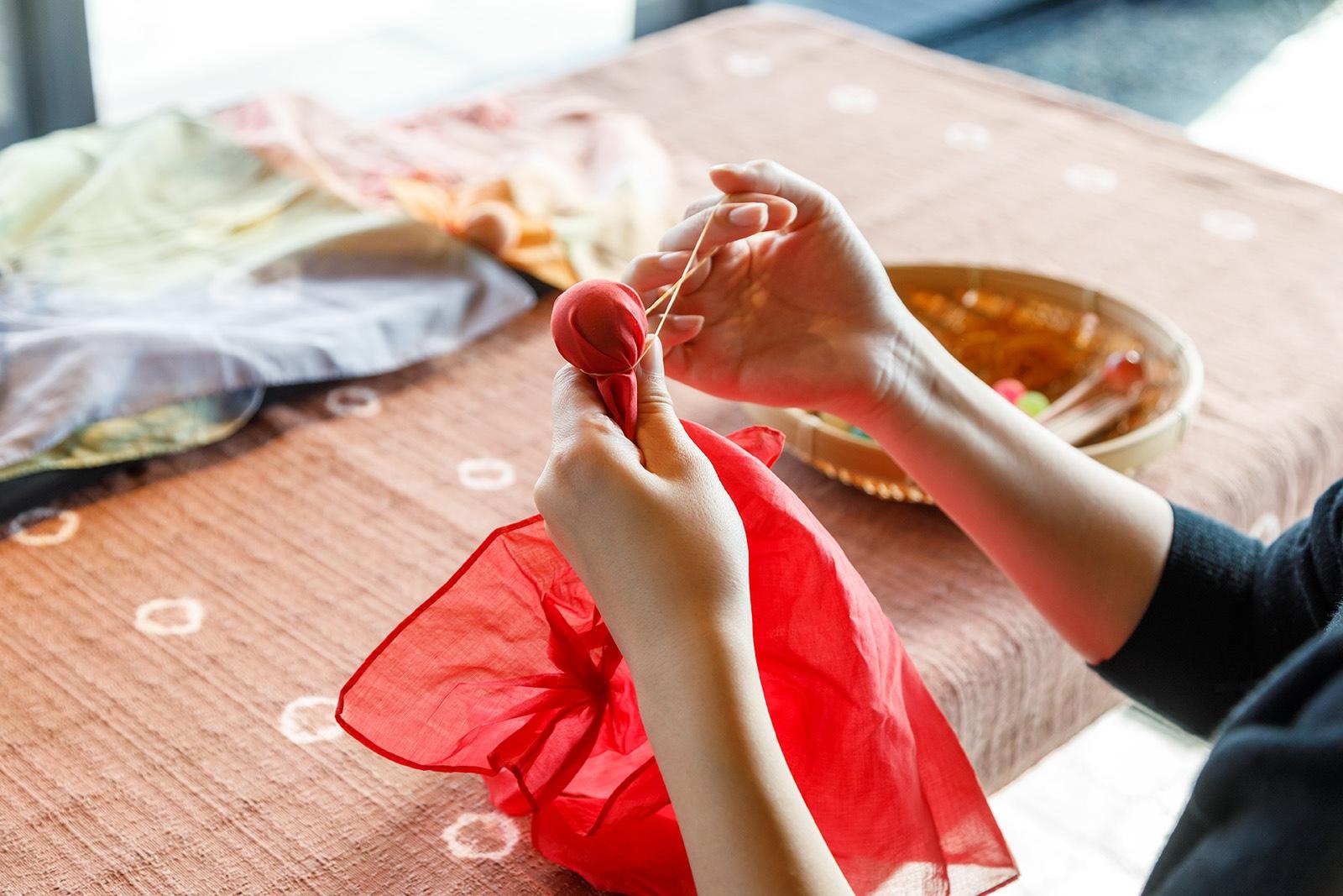 別府の温泉文化は、入浴だけにとどまらない。「界 別府」では、大分県伝統の「豊後絞り」のノウハウと温泉を掛け合わせたオリジナルの絞り染め体験をすることができる。自分の好きな色の木綿のハンカチを選び、布に絞りをつけていく。一通り好きなところに絞りの技法を施したら、界の温泉を使っての脱色の工程を待つこと15分。絞った部分の色が抜けて絞りの紋様が出る。●開催時間/毎日9:30〜10:30 料金/¥1,900 1回8人まで参加可能 4日前までに要予約