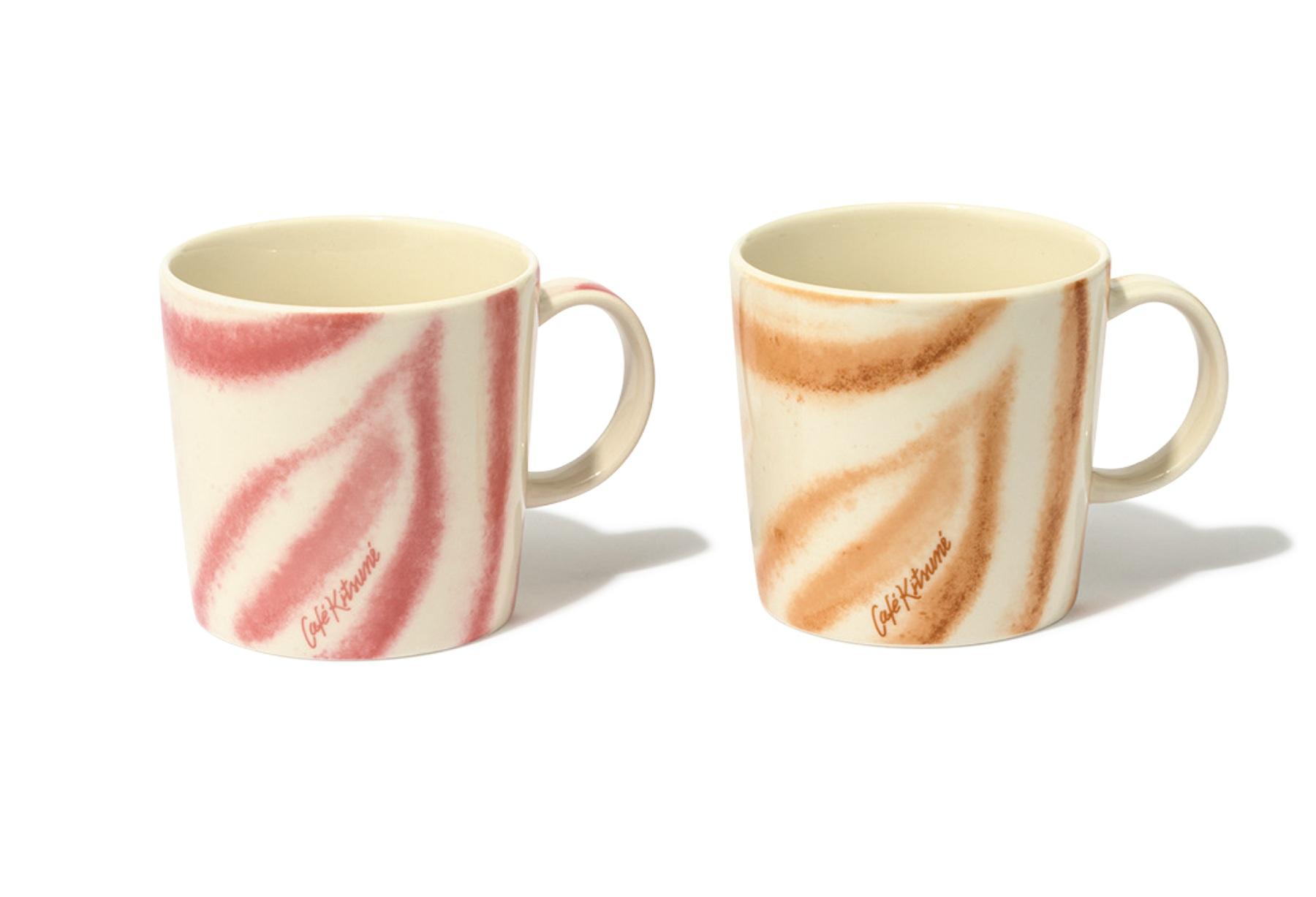 イッタラの代表作「ティーマ マグ」をベースに、釉薬仕上げのプリントを施した一品。ピンクは「サクララテ」、ブラウンは「カプチーノ」をイメージ。全4色。カフェキツネ×イッタラ マグ 300ml 各¥5,500(イッタラ)