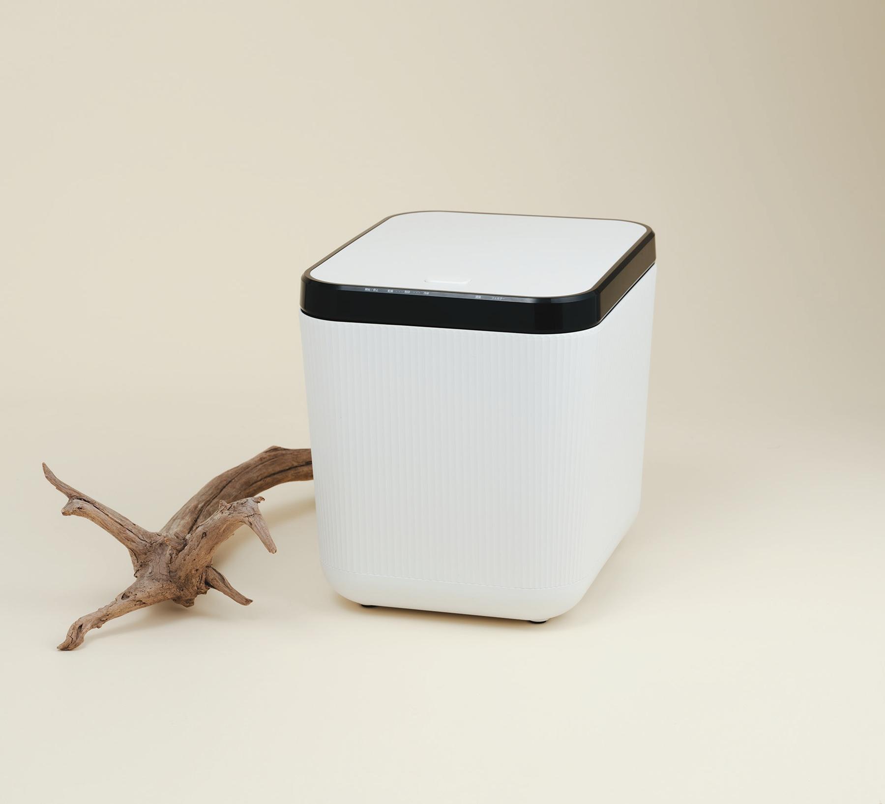 くず野菜や下処理後に残った魚の内臓などを粉砕&徹底乾燥させ、生ごみの量を最大90%削減。生ごみ処理機とは思えないシンプルなシルエットと電源ボタンを押すだけの操作性、図書館の静けさに相当する静音設計も魅力的。脱臭用の活性炭フィルター付き。「一番驚いたのは、ちょっとしたスペースにも置けるコンパクトなサイズ感。生ごみを簡単に処理でき、日々のストレスが減りました。乾燥後にパラパラになった粉砕物は可燃ごみとして捨てることもできますが、私はベランダ菜園や観葉植物の肥料として使っています」。W280×D348×H319mm ¥24,990(LOWYA TEL. 050-1750-0608)