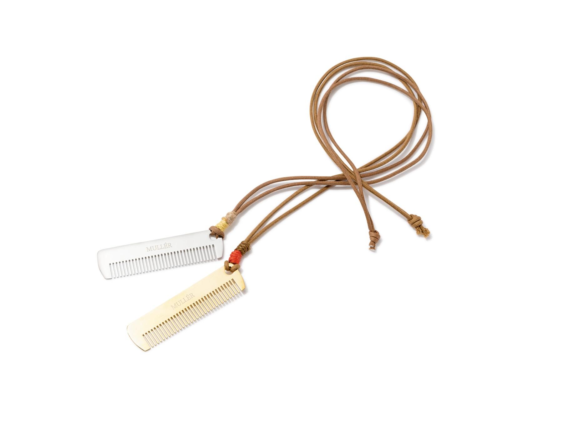 ブランドの刻印を施したステンレス製のコーム。ストラップは麻紐を一本一本手作業で巻き付け、温かみある仕上がりに。ネックレス感覚で首から下げてもかわいい。 各¥4,400(muller of yoshiokubo)