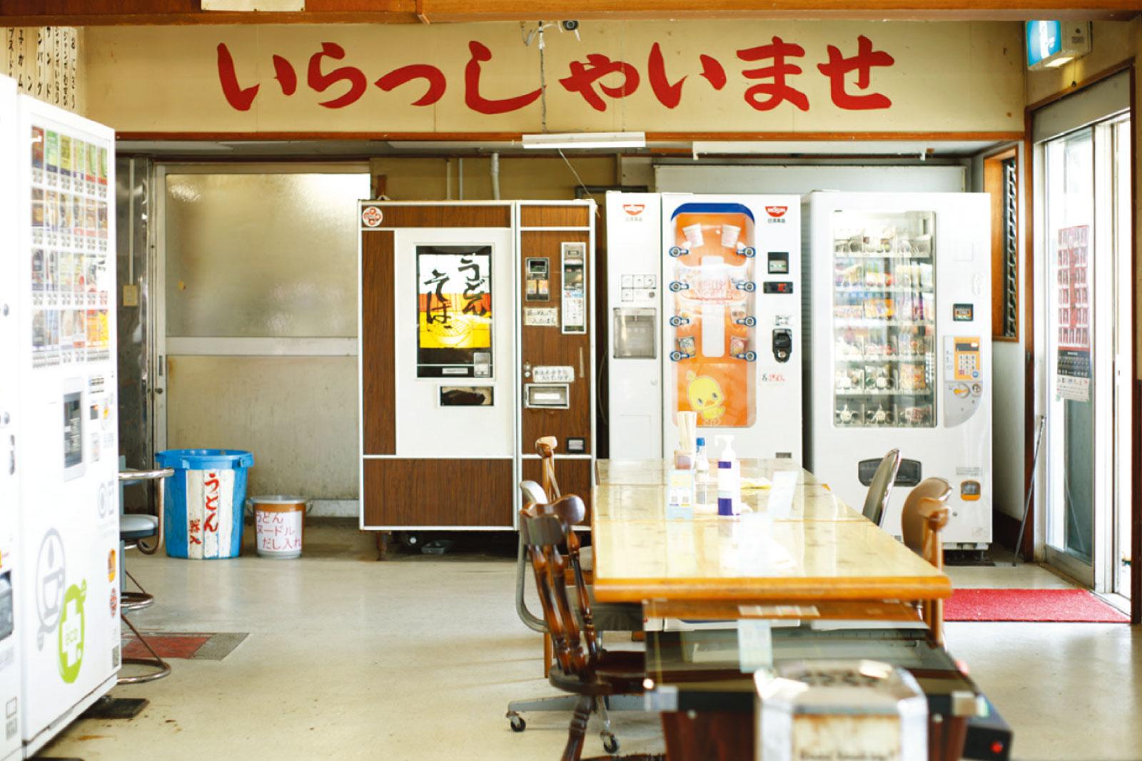 JR山陰本線折居駅の近く、国道沿いにあるドライブイン。昭和を感じる建物の中に入ると、自販機がズラリ!